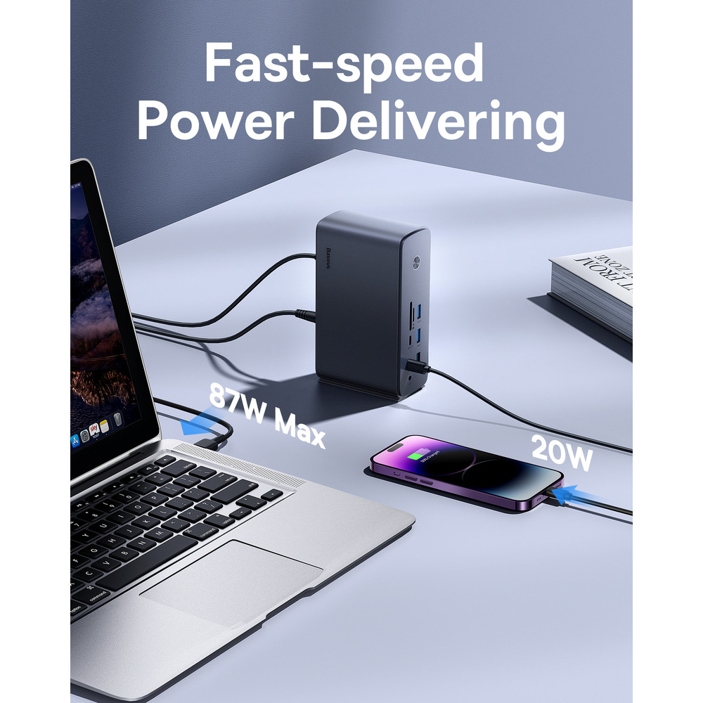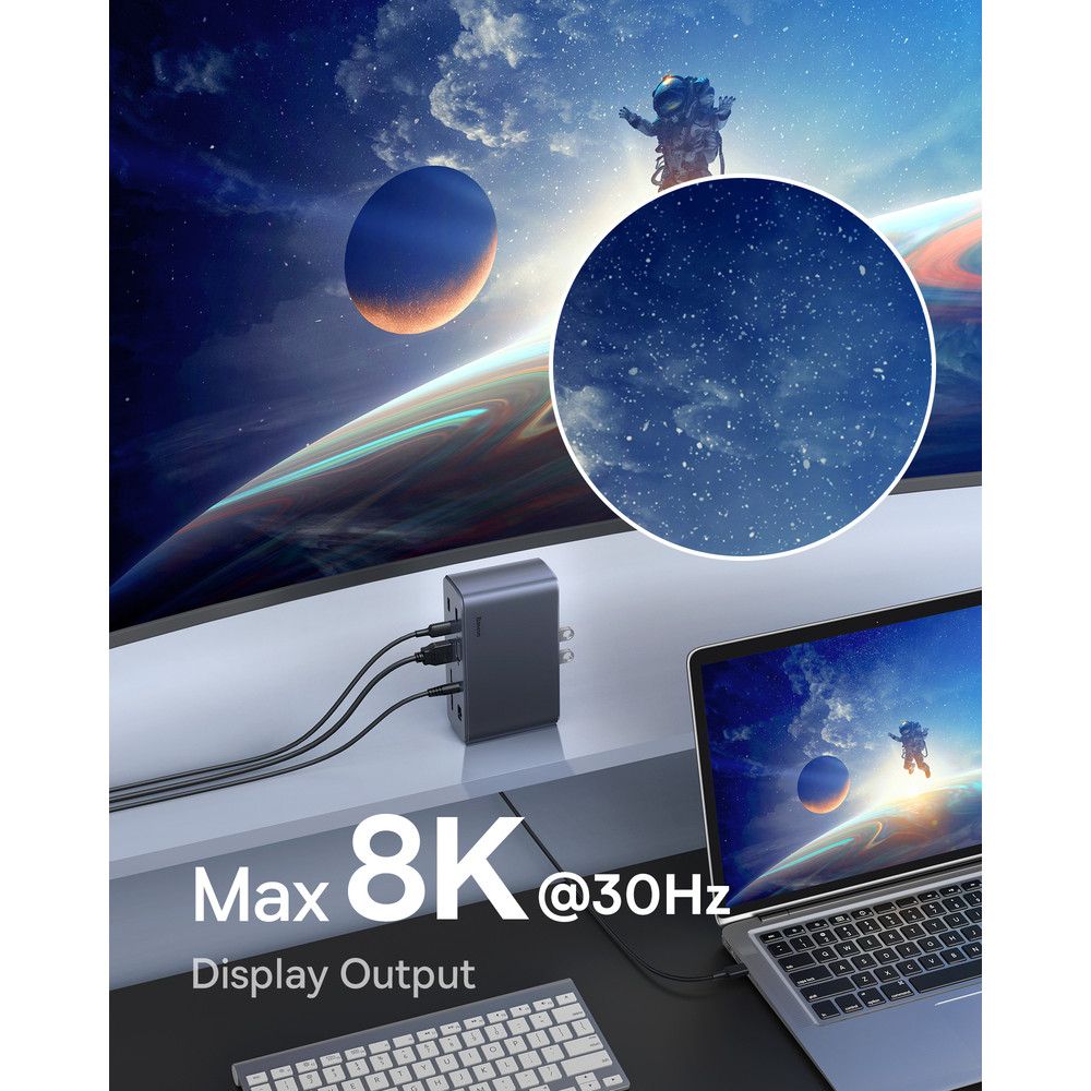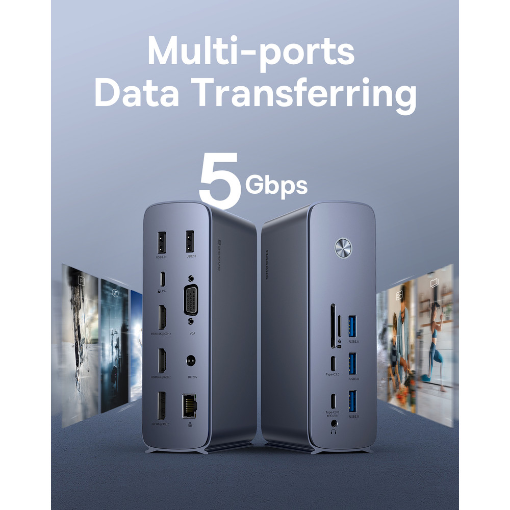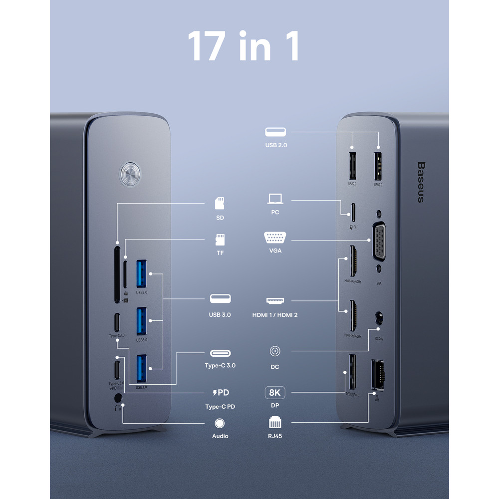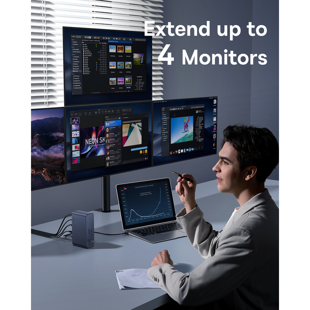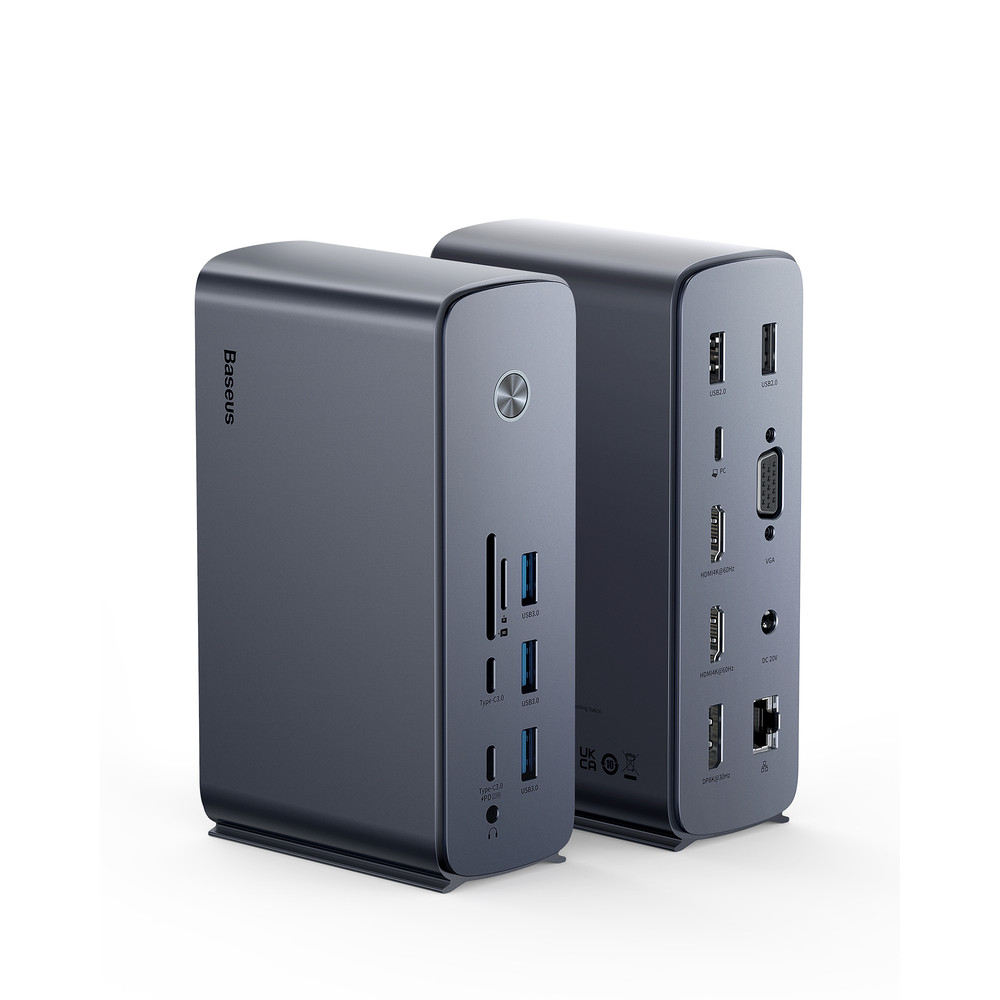 Baseus UnionJoy 17-Port Triple-Display Docking Station – универсальный USB-хаб, позволяющий значительно повысить производительность работы. Благодаря поддержке трех дисплеев одновременно вы можете расширить рабочее пространство на три монитора с разрешением 4K при 60 Гц .