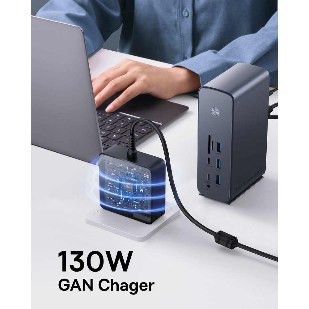 Хаб оснащен 17 портами , включая 5 USB-портов и Gigabit Ethernet для быстрого подключения к сети со скоростью до 1000 Мбит/с. Аудиоразъем позволяет подключать наушники или динамики для комфортного воспроизведения звука во время работы или отдыха.