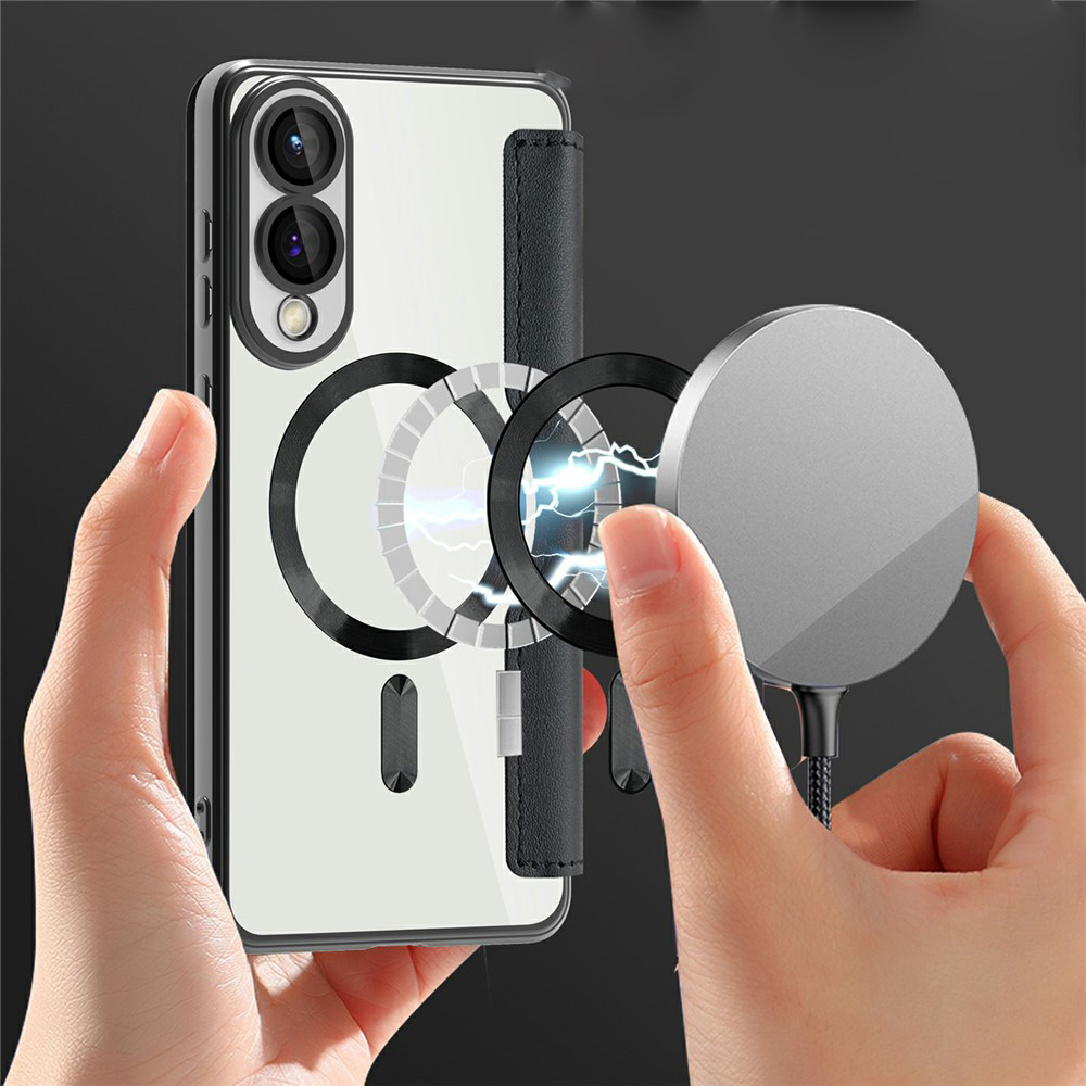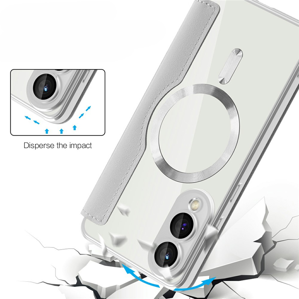 Чехол оснащён кольцом на задней панели, которое позволяет легко крепить его к магнитному держателю и использовать беспроводную зарядку. Кроме того, на внутренней стороне верхней крышки предусмотрены кармашки для карт или денег. Дополнительным преимуществом является защита объективов камеры благодаря силиконовым вставкам.