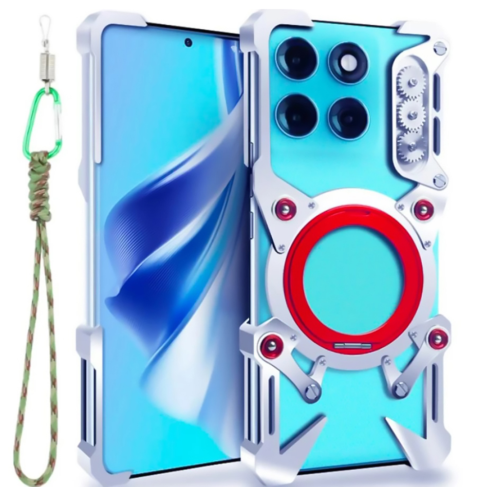 Изготовленный из металла, чехол обеспечивает повышенную прочность и устойчивость к ударам, падениям и царапинам. Его кибер-дизайн с винтовыми элементами и геометрическими линиями придает смартфону уникальный и технологичный вид.
