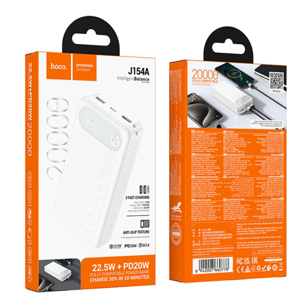 Hoco J154A Victorious – это высокоэффективный Power Bank , объединяющий значительную емкость и поддержку самых современных протоколов быстрой зарядки. Благодаря выходной мощности до 22.5 Вт этот внешний аккумулятор способен восстановить заряд смартфона в рекордно короткие сроки.