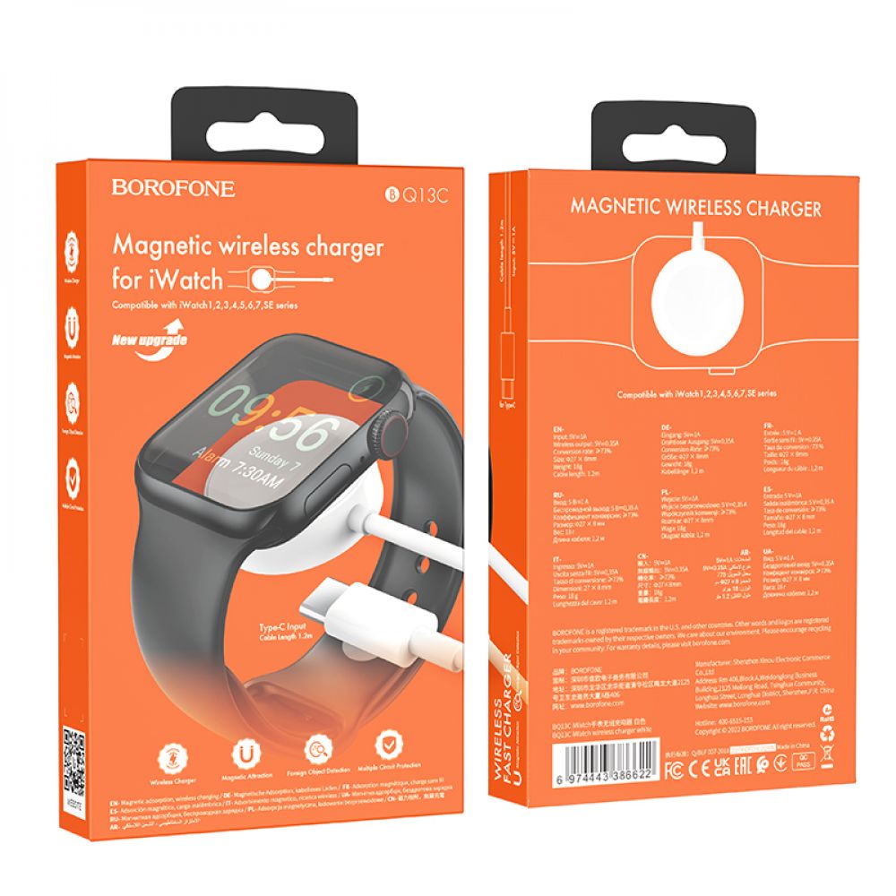 Беспроводное зарядное устройство Borofone BQ13C разработано в полном соответствии со стандартами качества корпорации Apple для безопасной зарядки iWatch 1-8 поколений, а также их версий SE/SE2 и Ultra. Аксессуар реализован в классическом дизайне, выделяется исключительной надежностью и длительным сроком службы. Его небольшой вес и оптимальная длина кабеля, равная 1.2 метра, обеспечат максимально комфортную повседневную эксплуатацию. Входной разъем Type-C (male) позволит использовать в качестве источника питания для него сетевой или автомобильный адаптер, повербанк, ноутбук или настольный ПК с силой тока на выходе соответствующего разъема 1A при напряжении 5V. Корпус разъема имеет практичную форму, выполнен методом литья под давлением из прочного пластика. Внешняя оплетка кабеля изготовлена из поливинилхлорида – эластичного материала, который отличается повышенной стойкостью к растяжению, перепадам температур и разрыву. Круглый магнитный интерфейс для беспроводной зарядки часов обеспечивает точное позиционирование гаджета и его надежную фиксацию, дополнен функцией обнаружения сторонних металлических предметов. Его толщина составляет всего 7мм, а диаметр – 27мм. Сила тока на его выходе равна 0.35A при напряжении 5V.