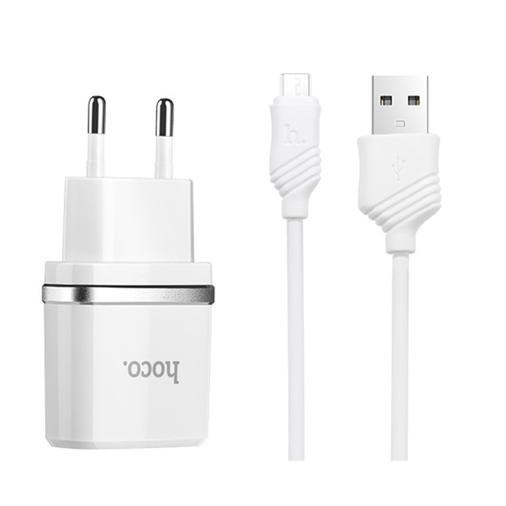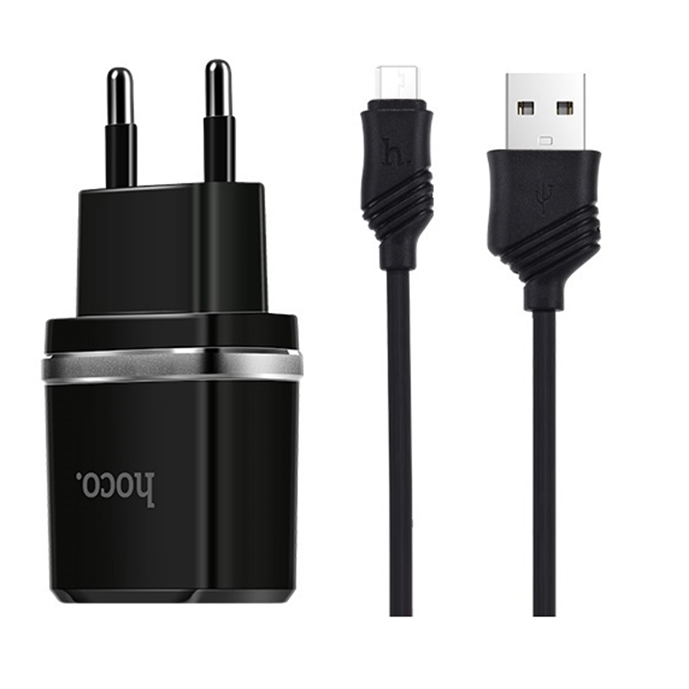 Корпус зарядного сделан из прочного глянцевого пластика, по кругу которого есть металлический ободок. Заряжать адаптер HOCO C12 может одновременно два устройства, ведь оборудован двумя USB портами, которые выдают 2,4А первый выход и 2,4А- второй соответственно. В комплекте к зарядке идет надежный Micro USB Data-кабель с фирменными лейбами длиной 1м.