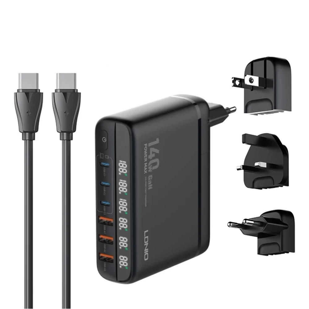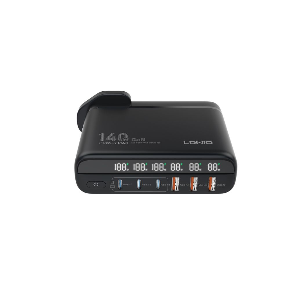 Сетевое зарядное устройство LDNIO A6140C - это компактный адаптер, который основан на передовой технологии GaN и поддерживает наиболее распространенные проколы быстрой зарядки, такие как: PD3.0/2.0, QC4.0/3.0/2.0, PPS, SCP, FCP. В отличие от обычных устройств с кремниевыми полупроводниками, его полупроводники изготовлены из нитрида галия. Благодаря усовершенствованным электронным компонентам, он, при своих небольших размерах, оснащен сразу 6 разъемами, LED дисплеем и способен одновременно заряжать несколько гаджетов с максимальной мощностью на выходе 140W. Корпус аксессуара выполнен в практичной форме, изготовлен из прочной комбинации ABS пластика и огнестойкого поликарбоната. На одной из его граней находится коннектор для фиксации удлинителя или одной из 3 сетевых вилок (A, G, C), а на второй - 3 разъема Type-C (C1, C2, C3) и 3 разъема USB (A1, A2, A3). Диапазон напряжения на входе составляет 100-240V при частоте 50-60Hz, максимальная сила тока - 2.5A. Мощность на выходе каждого из разъемов Type-C может достигать 100W (5V/3A, 9V/3A, 12V/3A, 15V/3A, 20V/5A) и 105W (3.3-21V/5A) для PPS, на выходе каждого из USB портов - 30W (4.5V/5A, 5V/4.5A, 5V/3A, 9V/3A, 12V/2.5A, 20V/1.5A). Во время одновременной зарядки 3 гаджетов через разъемы Type-C общая максимальная мощность на их выходе составит 140W: C1+C2+C3=65W+45W+30W. Модель оснащена кнопкой включения и LED дисплеем, на котором отображается исходящая мощность для каждого разъема. Безопасный, стабильный процесс зарядки обеспечивается системами многоуровневой защиты и интеллектуального распределения мощности. Устройство комплектуется удлинителем, 3 съемными сетевыми вилками (A, G, C) и кабелем Type-C - Type-C.