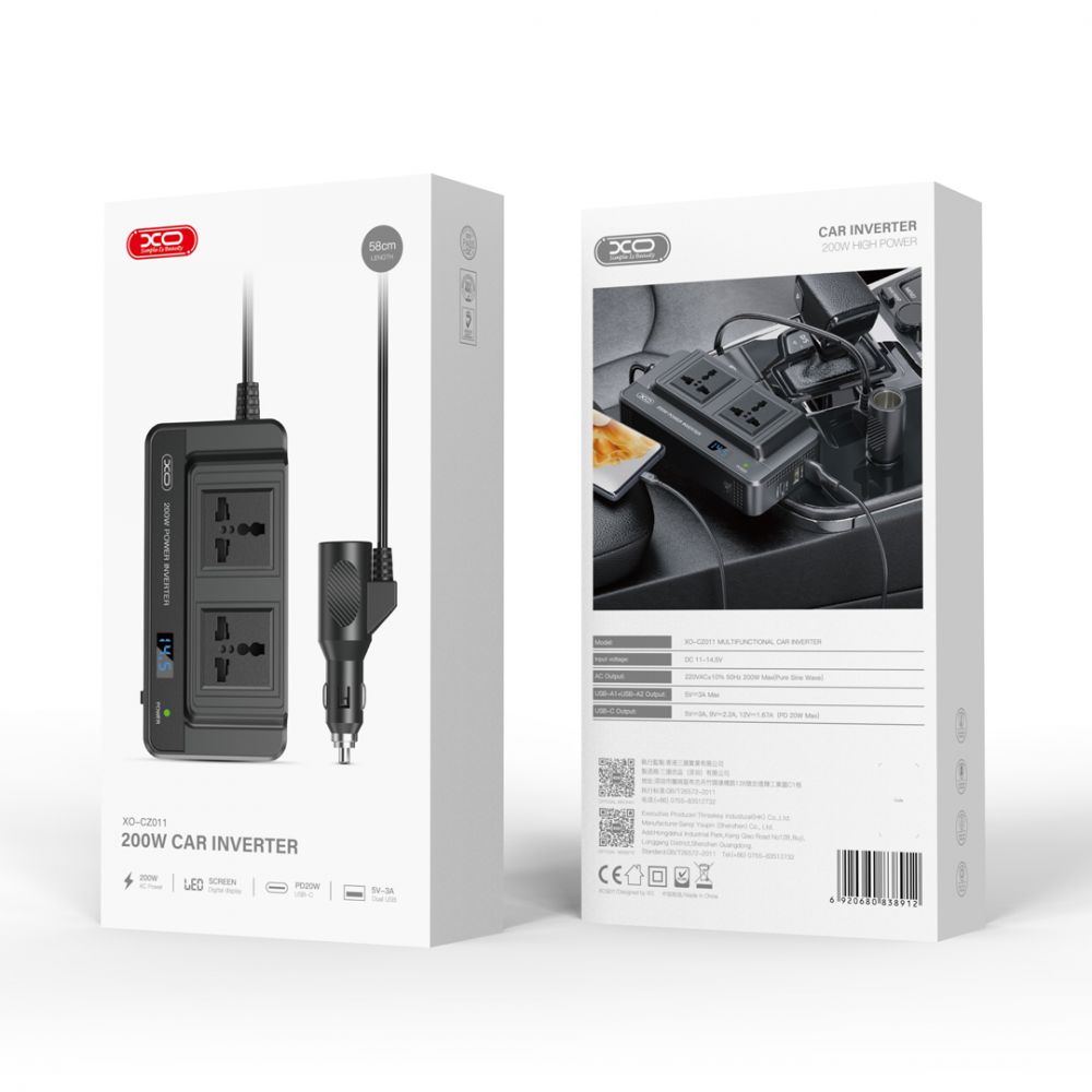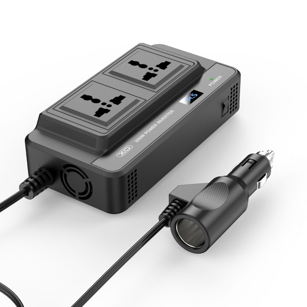 Автомобільний інвертор XO CZ011 200W - це універсальний пристрій, який допоможе під'єднати до електромережі авто різноманітні електроприлади зі стандартною мережевою вилкою, а також зарядити практично будь-який гаджет. Аксесуар стане справжнім помічником під час тривалих подорожей, відпочинку на природі та частих відключень електрики за відсутності генератора. Завдяки компактним розмірам, він не займе багато місця і з легкістю поміститься в бардачку більшості моделей автомобілів. Корпус інвертора надійно зібраний, виготовлений зі стійкого до ударів і підвищених температур пластику. На його верхній панелі розташовано пару універсальних розеток, LED дисплей, що відображає поточну напругу, і LED індикатор, який допоможе контролювати стан пристрою. На одному з його торців розташовані два USB роз'єми і роз'єм Type-C, на другому - вихід вбудованого кабелю, а на бічній панелі - кнопка ввімкнення. Кабель оснащений практичним роз'ємом для підключення до гнізда прикурювача, який зберігає можливість підключення до нього інших сумісних аксесуарів. Напруга 220V (±10V), частота 50Hz (±2Hz) і модифікована синусоїда на виході розеток дає змогу під'єднувати різні пристрої загальною потужністю до 200W. Водночас не рекомендується під'єднання обладнання з трансформаторними входами, електродвигунів та інших приладів з індуктивним навантаженням. Роз'єм Type-C підтримує швидку зарядку сумісних гаджетів за протоколами QC3.0 і PD з максимальною потужністю 20W (5V/3A, 9V/2.22A, 12V/1.67A). Загальна сила струму на виході роз'ємів USB становить 2.4A при напрузі 5V. Вхідна напруга становить 11-14.5V. Модель оснащена багаторівневою системою захисту та активною системою охолодження з перфорацією на бічних панелях і вбудованим кулером, що спрацьовує за температури понад 45°C.