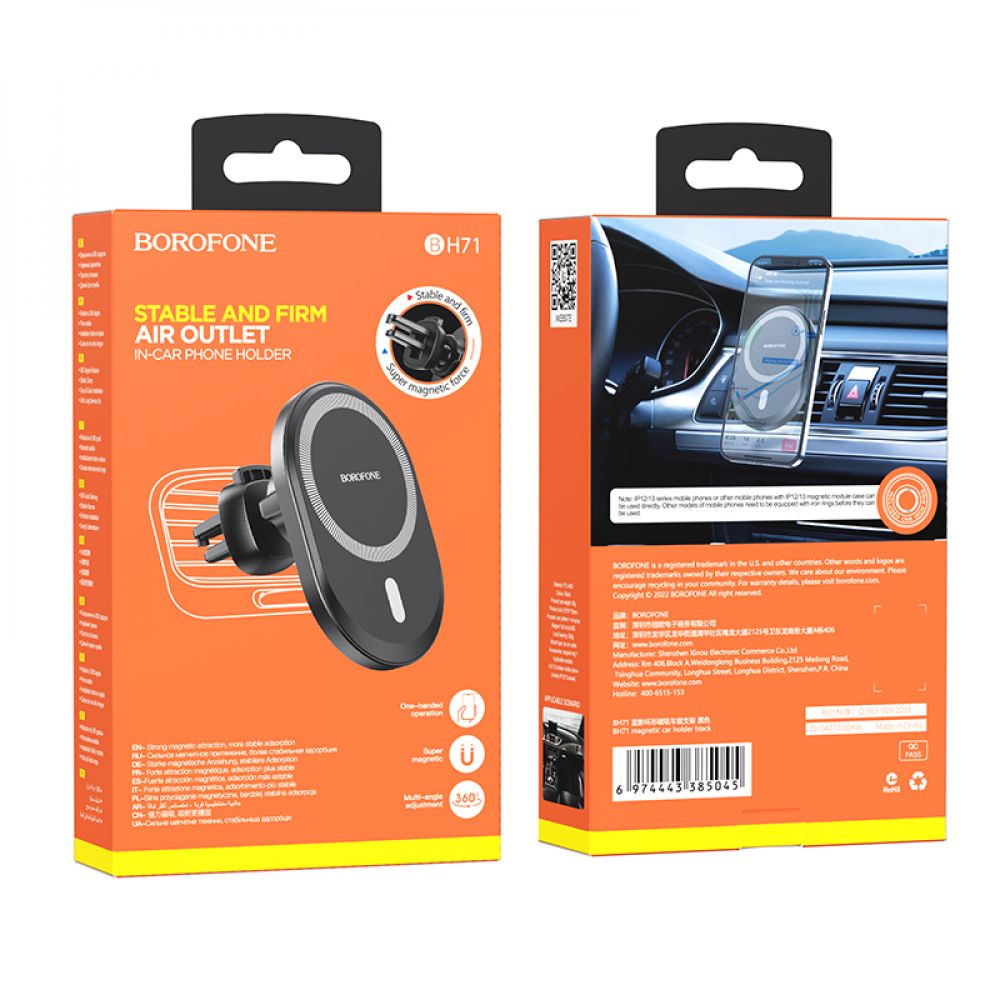 Автодержатель Borofone BH71 Magnetic car holder – это простой в использовании аксессуар, который сделает использование смартфона для водителя максимально удобным и безопасным во время управления автомобилем. Модель выполнена в минималистичном дизайне со стильными деталями, имеет компактные размеры и практичную конструкцию. Она разработана специально для iPhone 12 и новее, позволяет легко всего одной рукой, без лишних действий устойчиво зафиксировать гаджет с возможностью его вращения на все 360° вокруг своей оси. Держатель изготовлен из прочной комбинации поликарбоната и ABS пластика. Надежная фиксация смартфона обеспечивается мощными магнитами, способными выдерживать груз весом до 500 грамм. Крепление аксессуара на решетку воздуховода в салоне авто осуществляется с помощью зажима. Механизм зажима оснащен упругой металлической пружиной, а фиксаторы дополнены защитными силиконовыми накладками, которые уберегут панели решетки от царапин и потертостей. В комплект к держателю входит металлическая пластина.