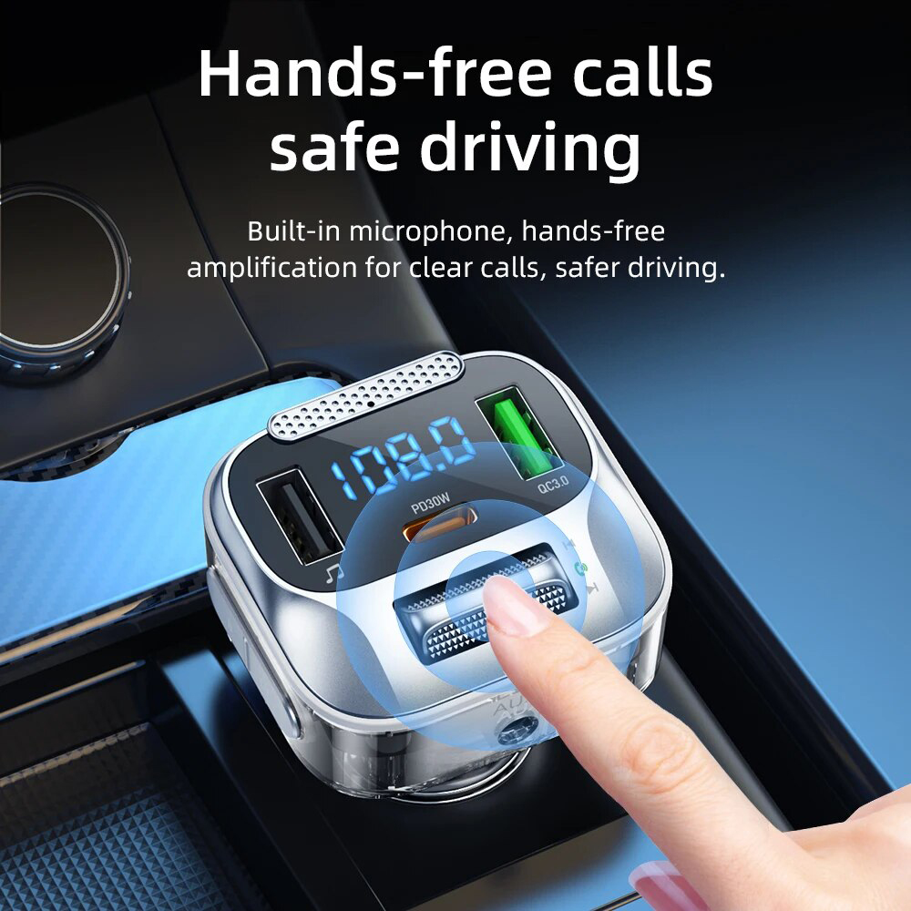 На верхней панели находятся удобные кнопки управления, отверстие встроенного микрофона, разъемы Type-С и 2USB, LED дисплей, отображающий текущую станцию. Разъем Type-С поддерживает зарядку с максимальной мощностью 30Вт по протоколам PD, PPS, QC, FCP и AFC. USB-порт совместим с технологиями QC, FCP и AFC, мощность на его выходе может достигать 18Вт. На боковой панели имеется AUX порт.