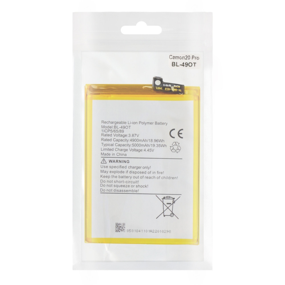 Аккумулятор-замена для смартфона Tecno Camon 20 Pro, модель BL-49OT. Класс качества AAAA, без фирменной маркировки (no LOGO). Обеспечивает совместимость с оригинальными характеристиками устройства и стабильную работу питания.