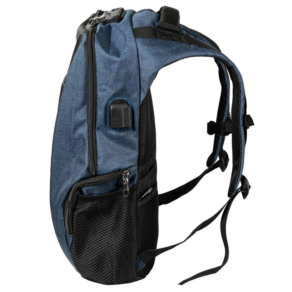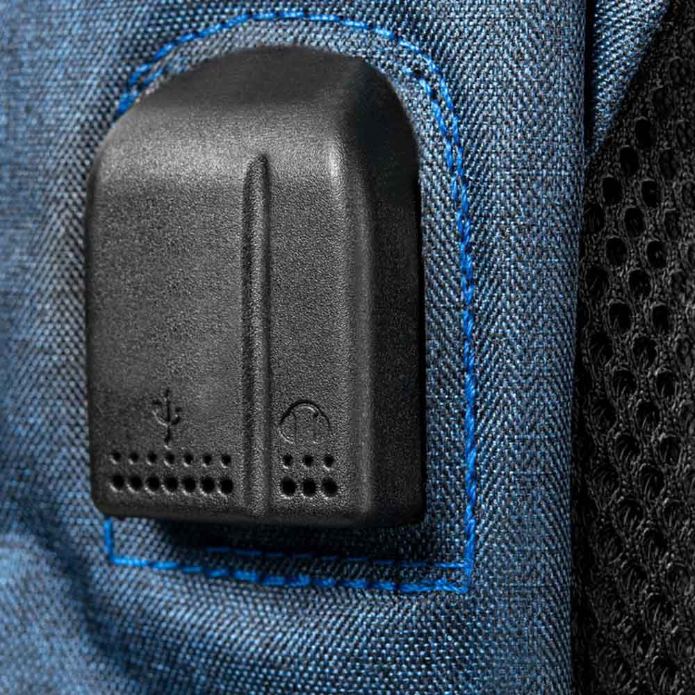 Рюкзак изготовлен из качественного полиэстера с вставками PU-кожи, на которой рюкзак имеет горизонтальный глубокий карман. По бокам расположены два сетчатые карманы, в которые можно положить бутылку с напитками, салфетки или другие предметы, и два кармана на молниях. Кроме того, здесь расположен USB-выход под зарядку и AUX-разъем для наушников, соответствующие кабели идут в комплекте и находятся внутри основного отделения. Таким образом вы можете заряжать свой гаджет и слушать музыку не вынимая гаджеты из сумки. Рюкзак укомплектован качественной фурнитурой, замки полуспрятаны и защищены от повреждений.