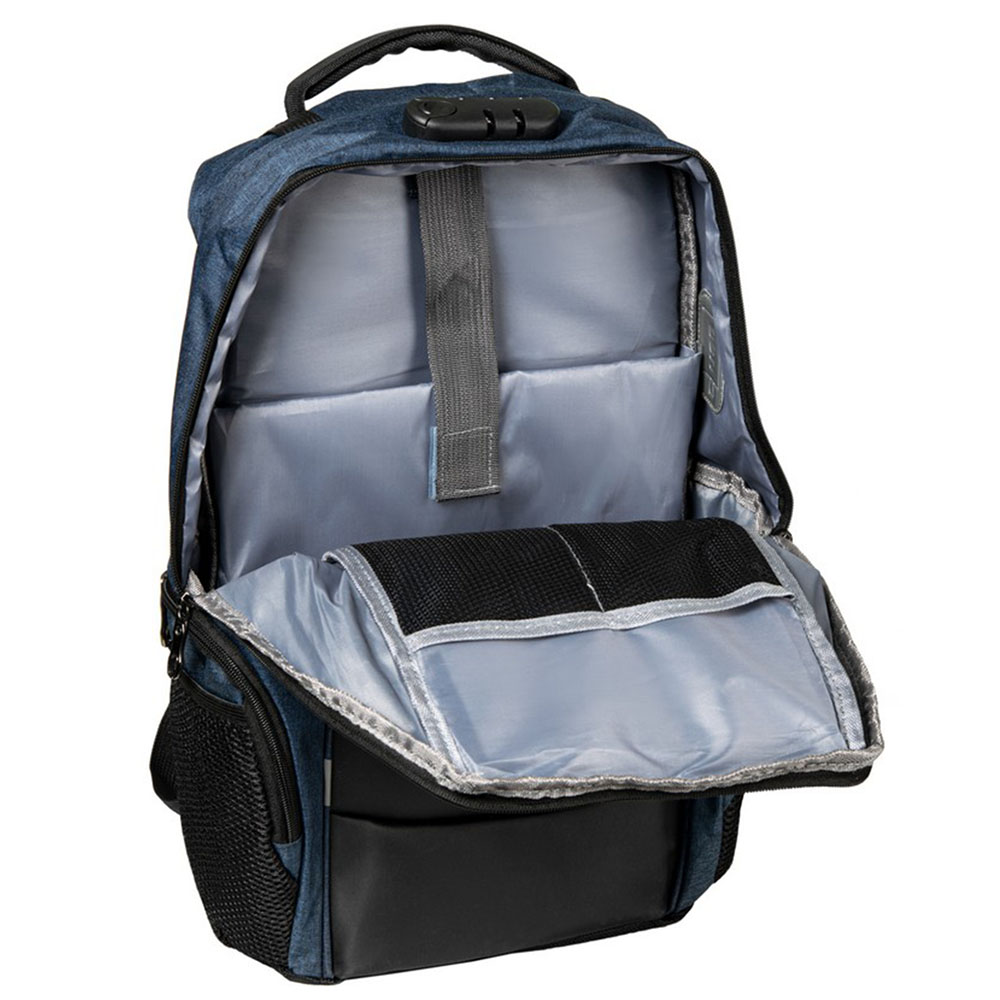 В основном отделении есть карман для планшета или ноутбука с диагональю до 15,6 дюймов, размеры кармана 270 * 450 * 160мм, стенки кармана утолщенные и мягкие, они служат в качестве амортизации при ударах или падении рюкзака, а специальная защелка надежно фиксирует ваши гаджеты в ней. Также, в основном отделении есть еще мини-органайзер с двумя открытыми сетчатыми карманами, в которые можно поместить мобильный телефон, блокнот или другие мелкие вещи.