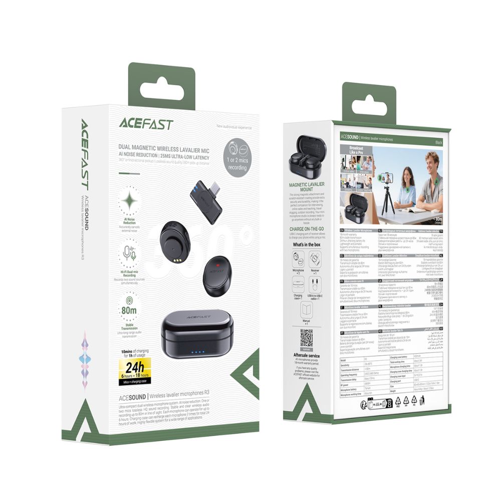 ACEFAST R3 – это современная радиосистема с двумя микрофонами, разработанная для контент-мейкеров, которым нужен безупречный звук в любых условиях. Благодаря всенаправленному захвату на 360° система фиксирует естественный и детализированный голос. Главной особенностью модели является интеллектуальная технология DEEP AI-шумоподавление , которая автоматически фильтрует посторонние звуки улицы, ветра или помещения, оставляя только четкий язык.
