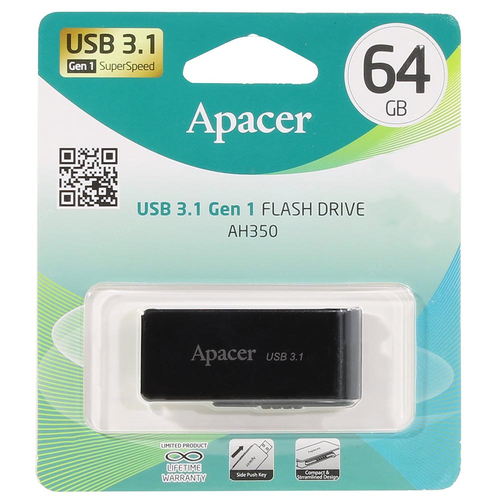 Флешка Apacer AH350 - это Usb накопитель, для передачи файлов. Стильный дизайн черного цвета, и боковые вставки белого цвета, на корпусе есть отверстие для шнурка, можно подцепить к брелка, ключей. Интерфейс USB 3.1, компактная, и практическая, объем памяти 64GB, можно вместить множество информации, материалов. Размеры составляют 53.4 x 23.2 x 7.5 мм, вес 8 грамм.
