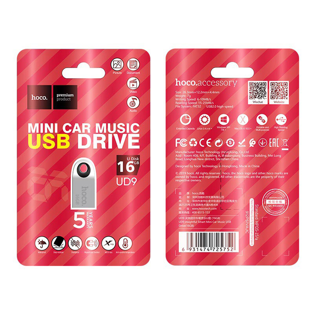 USB Флешка Hoco UD9 - идеальное решение для хранения информации. Флешка Hoco UD9 изготовлена из высококачественного металла и с матовым покрытием, поэтому выглядит стильно и современно. Упаковка является достаточно прочной и надежной, флешки не повредится при транспортировке. Объем памяти составляет 16 GB-идеальный вариант для хранения необходимой информации. Скорость записи информации составляет 6-10 МБ / с, скорость чтения информации - 15-25 МБ / с.