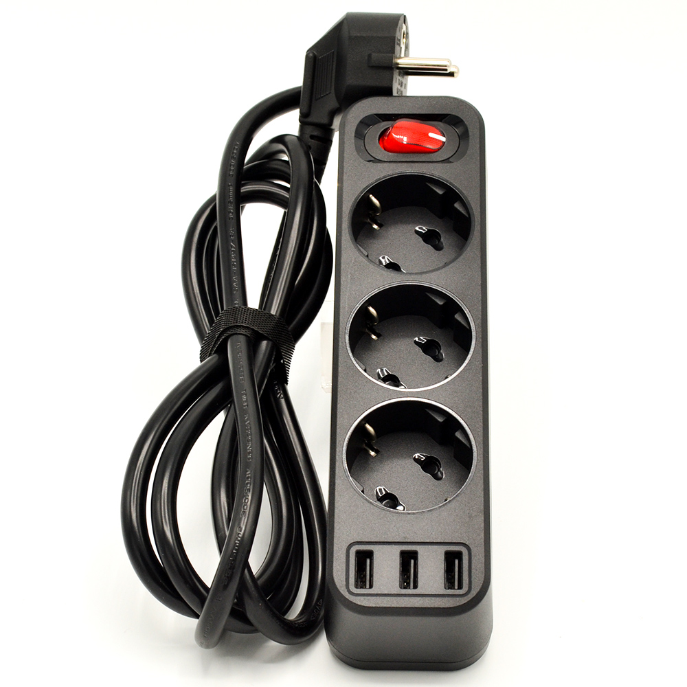 Корпус изготовлен из высококачественного огнестойкого корпуса. Кабель обладает качественным сплетением и выполнен с усиленной защитой в местах соединения с основным блоком и вилкой. Аксессуар совместим с электросетями с напряжением 100 - 240В, и, конечно, в таком мощном удлинителе предусмотрена защита техники от перегрузки и перепада напряжения. Максимальная прочность заряда может достигать 12 Bт. В устройстве встроены 3 USB-порта, 3 розетки крепостью 4000W европейского стандарта и кнопка включения.