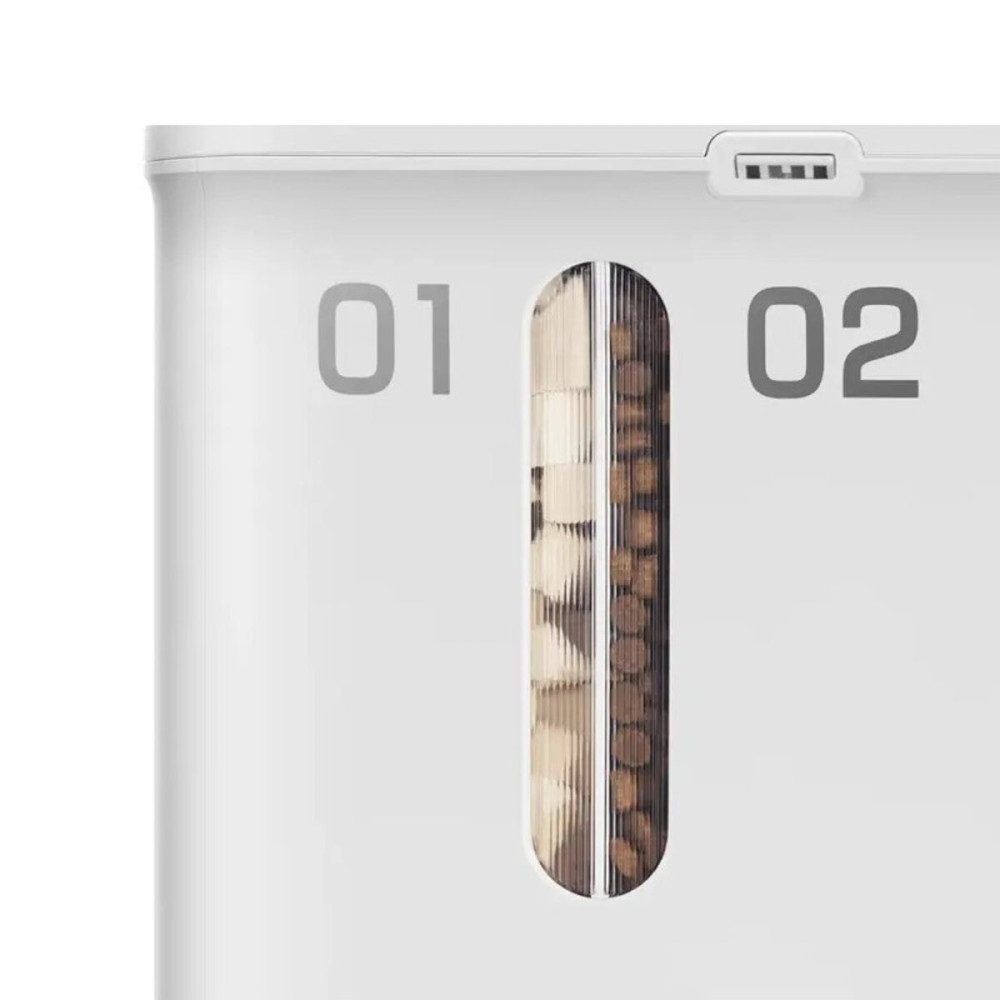 График приёмов пищи и количество корма можно задавать через приложение. Кормушка автоматически выдаёт корм по расписанию. Контейнер на 5 литров обеспечивает запас корма примерно на 21 приём пищи для взрослой кошки. Конструкция защищает продукты от влаги, плесени и насекомых.
