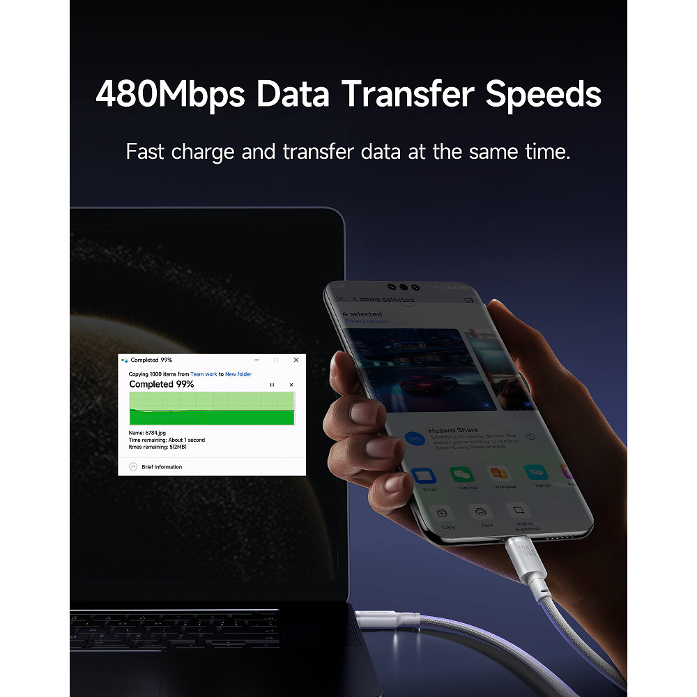 Дозволяє швидко синхронізувати та передавати файли між пристроями. Зручна довжина для будь-яких умов використання — вдома, в офісі або в дорозі, надаючи свободу рухів та легкий доступ до зарядного пристрою.