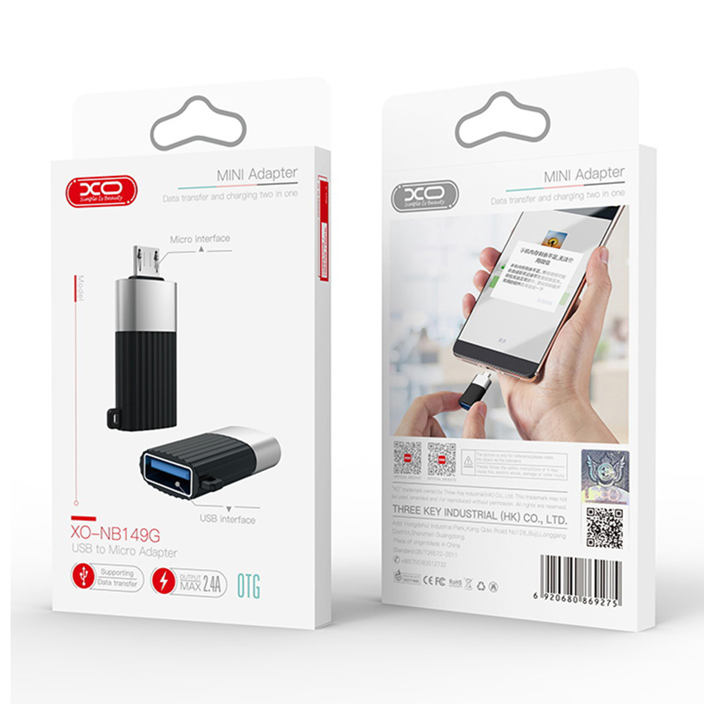 XO NB149G - компактний перехідник, який виконує дві функції: передачі даних та заряджання. Перехідник виготовлений у пластиковому корпусі довжиною лише 24 мм, має роз'єм USB і конектор Micro-USB. До корпусу прикріплений ремінець. Ця модель розрахована на передачу струму з максимальною силою 2,4А.