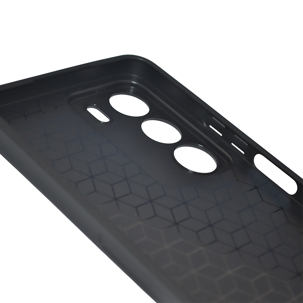 Накладка виготовлена із міцного термополіуретану, що забезпечує захист телефона при ударах чи падінні. Накладка з екошкіри не лише прикрашає собою панель чохла, а й дарує приємні тактильні відчуття. Текстурована поверхня з вуглецевим візерунком додає стильного вигляду та запобігає ковзанню в руці.