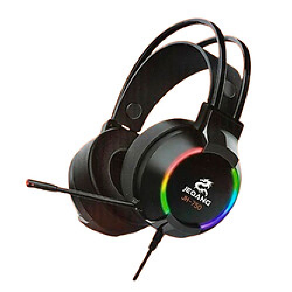Ігрові навушники Jeqang JH-750 7.1 поєднують у собі стиль, функціональність та кришталево чистий звук для максимального залучення до ігрового процесу. Аксесуар реалізований в оригінальному, футуристичному дизайні. Матові та глянсові деталі у поєднанні з градієнтним RGB підсвічуванням відображають його ігрову спрямованість. Завдяки ергономічній конструкції та невеликій вазі їх можна підлаштувати під розмір голови будь-якої людини та використовувати тривалий час без відчуттів дискомфорту. Корпуси вушних елементів та дві дуги обода виготовлені із міцного, стійкого до навантажень пластику, а еластична накладка оголов'я та обшивка м'яких амбушюр – із зносостійкої штучної шкіри. Відтворення об'ємного звуку з віртуальним ефектом 7.1 здійснюється сучасними драйверами діаметром 50мм. На одному з вушних елементів розташовані вихід вбудованого кабелю та чутливий всеспрямований мікрофон на гнучкій ніжці, який реалістично передає мову. Кабель довжиною 2.2 метра захищений зовнішньою обплетенням з PVC, оснащений роз'ємами USB (male) для подачі живлення для підсвічування та двома роз'ємами AUX 3.5mm (male) для підключення до аудіо інтерфейсів IN та OUT комп'ютера.