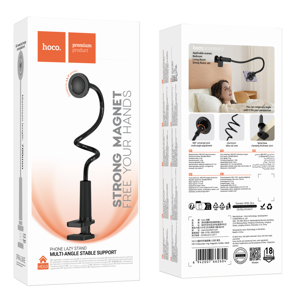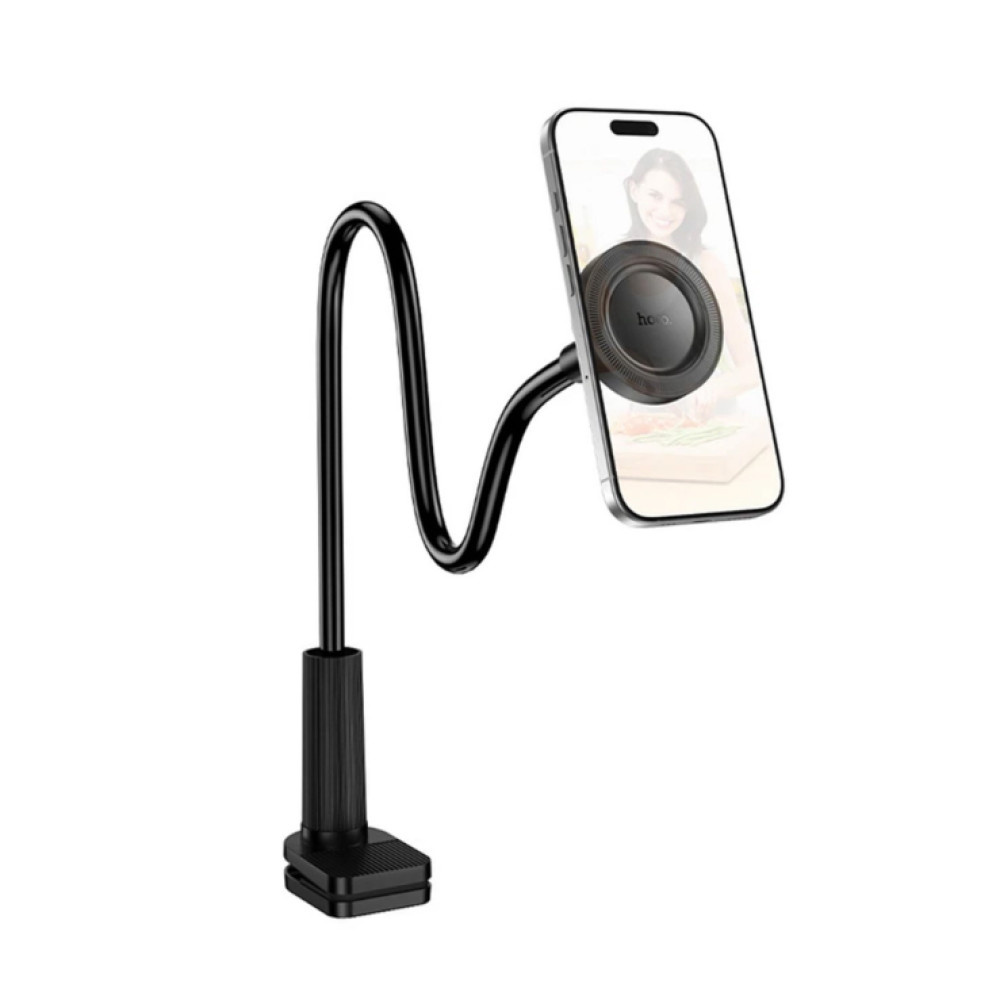 Hoco HD13 — це універсальний аксесуар категорії «lazy stand», створений для звільнення рук під час використання смартфона. Гнучка штанга довжиною 700 мм має міцний алюмінієвий сердечник, що дозволяє надавати тримачу будь-яку форму та надійно утримувати гаджет у вибраному положенні. Магнітна голівка з шарнірним з'єднанням забезпечує обертання на 360°, дозволяючи точно налаштувати кут огляду для перегляду відео або здійснення відеодзвінків.