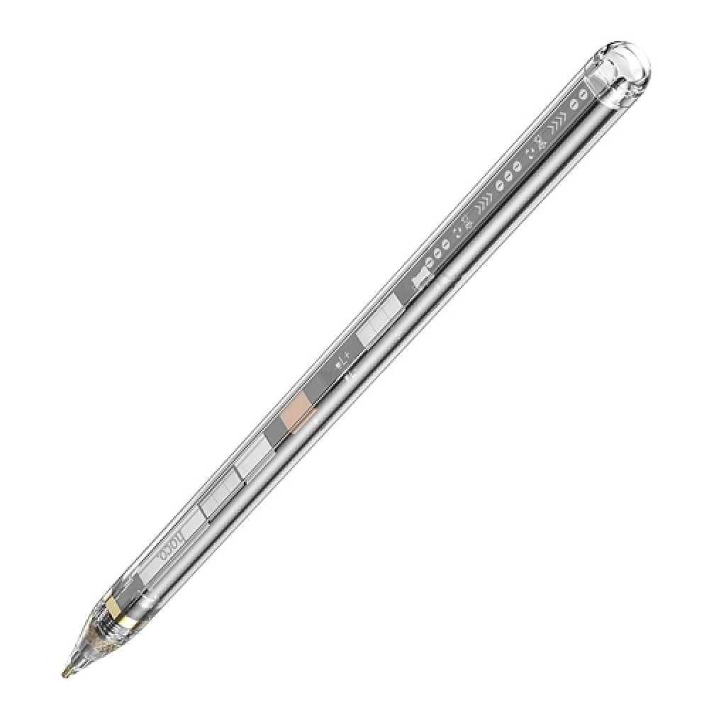 Hoco GM110 Transparent Explore Series Active – це активний стілус, який значно покращить користувальницький досвід при роботі з iPad, зробить його більш підходящим для творчих та професійних завдань, таких як: малювання, редагування фотографій, робота з таблицями та створення нотаток. Він дозволить легко виводити точні лінії необхідної товщини, підвищить ефективність в іграх та полегшить роботу у додатках, в яких потрібна підвищена точність. Аксесуар привертає увагу стильним, незвичайним дизайном прозорим корпусом, через який можна детально розглянути всі електронні компоненти. Його розміри можна порівняти з розмірами звичайної ручки, тому його легко тримати звичним хватом і використовувати тривалий час. Підтримка функції захисту від випадкових дотиків до екрану принесе додатковий комфорт у його експлуатацію. Корпус стілус має приємну на дотик поверхню, виготовлений з міцного пластику. Наконечник його знімної насадки виготовлений із зносостійкого поліоксиметилену (POM) – полімерного матеріалу, що забезпечує повноцінне спрацювання сенсора екрану, ідеальний баланс між тертям та ковзанням, не викликає утворення подряпин та потертостей. Аксесуар оснащений акумулятором ємністю 100mAh, магнітами для його фіксації з одночасною бездротовою зарядкою на бічній межі сумісного iPad. Час його безперервної роботи становить близько восьми годин. Стілус сумісний з декількома десятками моделей iPad 2018 випуску і новіший.
