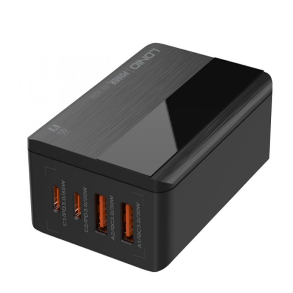 Мережевий зарядний пристрій LDNIO A4808Q - технологічний аксесуар, що відрізняється винятковою надійністю та універсальністю. Дана модель стане чудовим вибором для домашнього використання, сумісна з величезною кількістю сучасних портативних гаджетів, підтримує PD3.0 і QC3.0, оснащена 4 інтерфейсами, завдяки чому зможе повноцінно замінити кілька адаптерів. Аксесуар має привабливий зовнішній вигляд і практичну конструкцію. Його корпус виконаний із заокругленими бічними ребрами, лицьова панель має приємну на дотик текстуровану поверхню та глянсову накладку, що прикриває LED дисплей, який відображає силу струму та напругу. На нижній панелі є протиковзні накладки, на одній з бічних - роз'єм для підключення мережного кабелю, а на другій - пара USB портів і пара роз'ємів Type-C. Максимальна потужність на виході кожного з роз'ємів Type-C може досягати 65W, USB – 30W. Загальна потужність на виході всіх роз'ємів під час заряджання 4 гаджетів становитиме 40W.