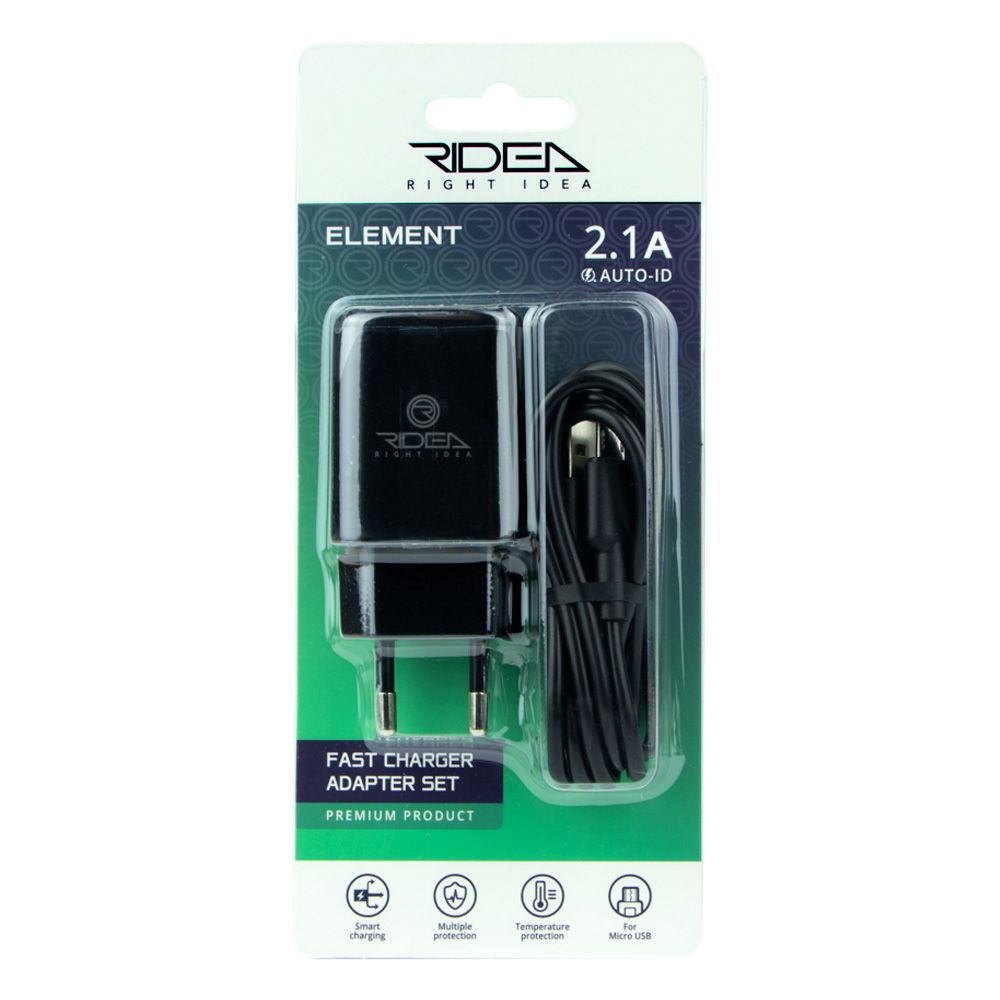 Мережевий зарядний пристрій Ridea RW-11111 Element Micro має компактні розміри і невелику вагу, а також здатність гарантувати абсолютно безпечний, стабільний процес заряджання. Модель реалізована у вишуканому дизайні із заокругленими кутами та ребрами, що у поєднанні з глянсовою поверхнею створює чарівний візуальний ефект та забезпечить користувачеві приємні тактильні відчуття, зробивши повсякденну експлуатацію максимально комфортною. Корпус адаптера виконаний у зручній формі, надійно зібраний, виготовлений із міцного пластику, який відрізняється стійкістю до ударів, подряпин та потертостей. На одній з його бічних панелей знаходиться стильний логотип виробника, на нижньому торці розташована штепсельна вилка європейського стандарту, а на верхньому - роз'єм USB, максимальна сила струму на виході якого становить 2.1А. Завдяки надійним контактам роз'єм зберігає свою функціональність навіть через 5000 циклів підключень. Модель оснащена функцією auto-id для автоматичного визначення необхідної підключеного гаджета потужності, забезпечена багаторівневою системою захисту від короткого замикання, стрибків напруги, перевантаження та перегріву. У комплект до адаптера входить кабель USB – Micro-USB.