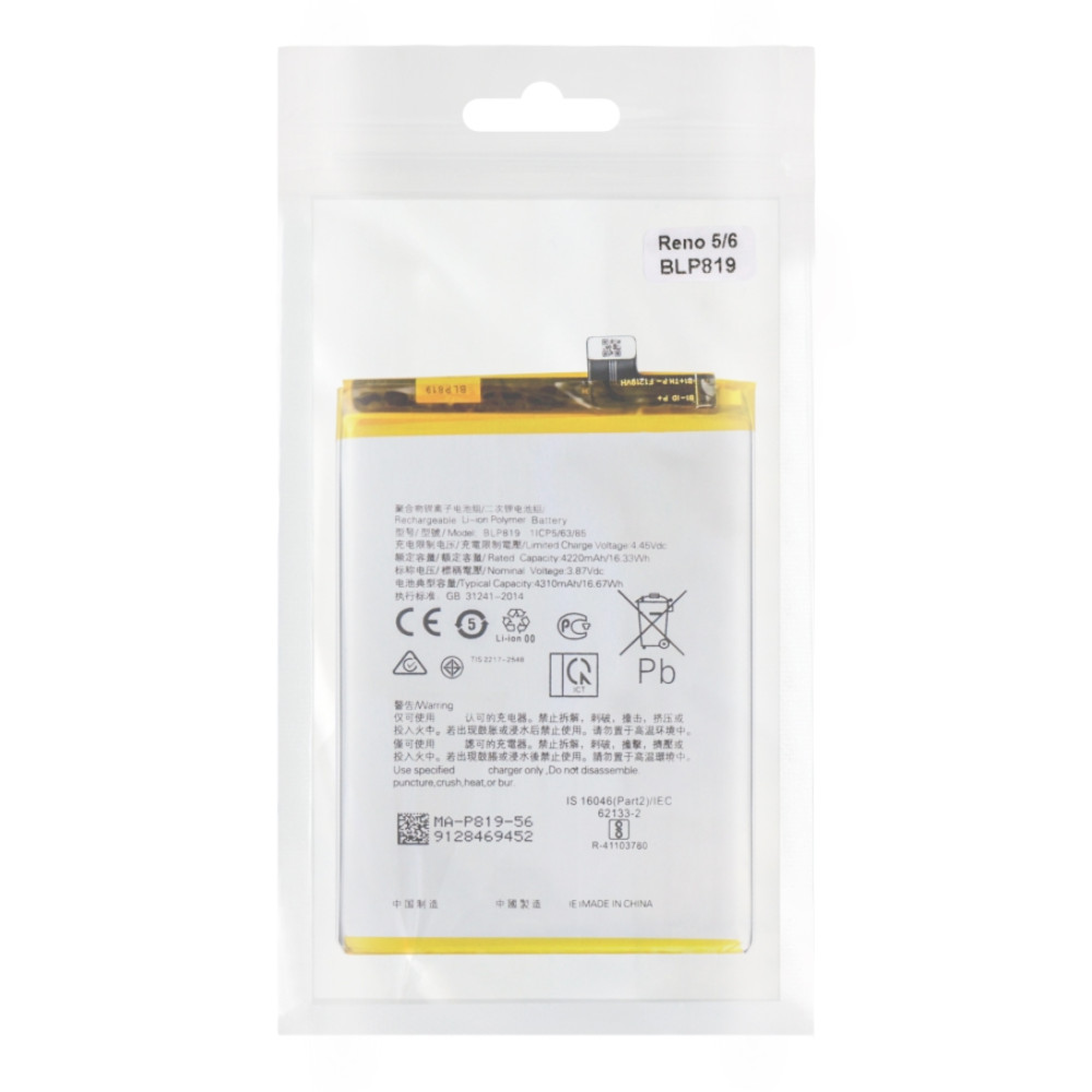 Заміна оригінального акумулятора для смартфонів Oppo Reno 5 та Oppo Reno 6 з модельним позначенням BLP819 . Висока якість AAAA забезпечує стабільну роботу пристрою та сумісність із заводськими параметрами.