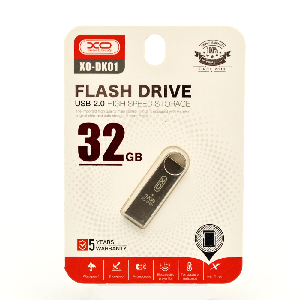 XO DK01 — це носій інформації на основі флеш-пам'яті, сумісний з усіма пристроями з портом USB. Ви зможете передавати та зберігати на ній дані. Об'єм пам'яті становить 32 ГБ, версія USB - 2.0.