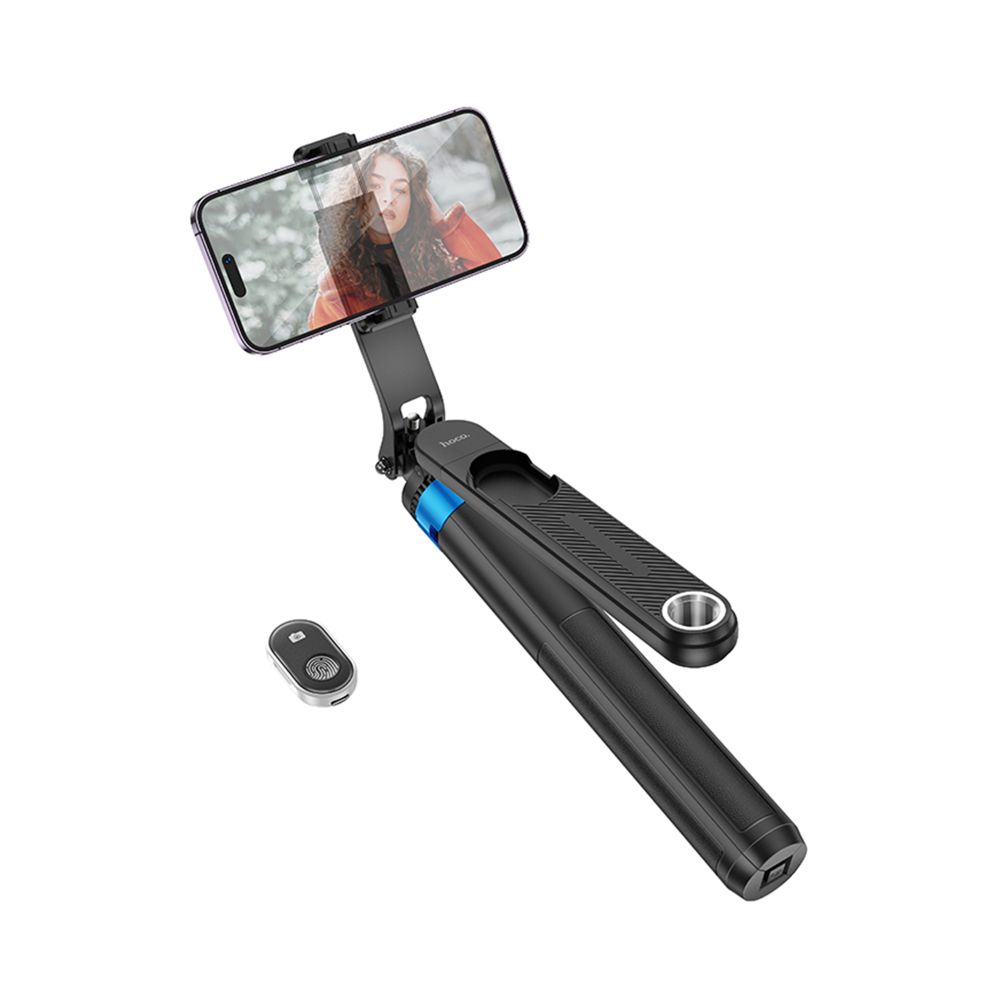 Hoco K22 оснащен ручкой для удобного управления, что значительно упрощает использование. Чтобы открыть ножки штатива, достаточно нажать кнопку PuSH в нижней части конструкции. Затем установите смартфон в держатель, отрегулируйте нужную высоту и выберите идеальный ракурс. Подключение к смартфону осуществляется через пульт с поддержкой Bluetooth 5.2, который позволяет делать фото на расстоянии до 10 метров.