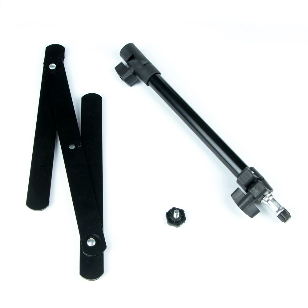 Устройство изготовлено из прочной комбинации пластика и металла, состоит из штатива, который крепится болтом к опорам из трех планок, соединенных шарнирами. Такая практичная реализация предоставляет возможность расположить снимаемый предмет прямо у основания штатива, при этом его опоры не будут мешать и попадать в кадр. Модель поставляется в разобранном виде и легко собирается, для чего не требуется специальных умений и инструментов.