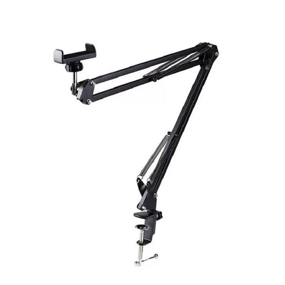 Подпружиненный штатив-пантограф на струбцине - это простое в эксплуатации устройство, которое поможет расположить смартфон или планшет в самом удобном положении: на необходимой высоте и под нужным углом. Данный аксессуар выделяется исключительной надежностью, практичностью и универсальностью. Он совместим с большинством моделей смартфонов и планшетов, может использоваться дома, в офисе или учебном заведении. Крепясь на краю стола или полки он лаконично впишется в любой интерьер, не займет много места и не будет отвлекать на себя внимание в сложенном виде. Каждый из двух рычагов штатива имеет длину около 350мм, оснащен двумя пружинами и состоит из двух параллельных направляющих, что в сочетании с шарнирными соединениями обеспечивает возможность гибкой настройки высоты и угла наклона. Шарнир у основания позволяет поворачивать штатив на все 360°, а центральный шарнир в месте соединения рычагов - полностью сложить их и разложить с углом от 0° до 180° по отношению друг к другу. С помощью винтового зажима, выполненного по типу струбцины, его можно закрепить на краю стола или полки толщиной до 5.5см. Штатив комплектуется двумя держателями (для смартфона и планшета), которые легко крепятся шаровым шарниром на торце верхнего рычага.