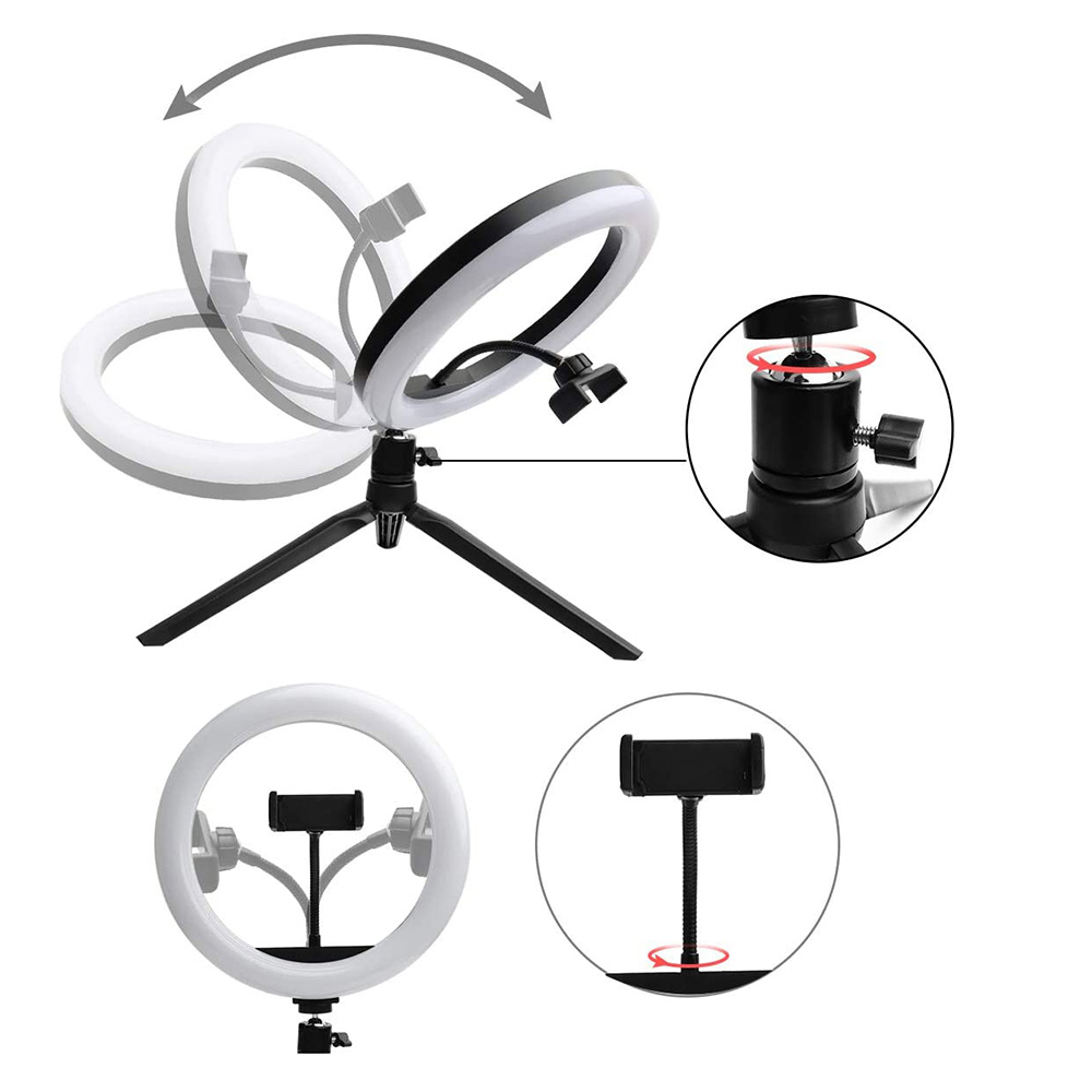 Кольцевая лампа XO BGD007 есть средних размеров, ее диаметр равен 26 см, а толщина корпуса 3,3 см. Благодаря шарнирному креплению со стандартным винтом 1/4 лампу можно зафиксировать практически на любом штативе. Большим плюсом модели XO BGD007 является то, что в комплект к ней входит тренога на которую лампу также конечно же можно зафиксировать. Кроме треноги и шарнирного крепления в комплекте есть пружинный держатель с гибкой ножкой для телефона и пульт дистанционного управления. Такой пульт, который работает на батарейке CR2025 и сигнал которого действует на расстоянии до десяти метров, особенно пригодится, если вы занимаетесь съемкой фото и видео самостоятельно. Эта лампа RGB и поэтому кроме стандартных режимов холодного, теплого и естественного света есть около сорока режимов разноцветного света, можно сказать на все случаи жизни. Кроме выбора режима доступен и выбор уровня яркости освещения. Свет мягкий, не разит глаза, лампа не бликует, поэтому вести стрим при освещении лампы можно комфортно. Свет кольцевой подключается к питанию кабелем USB, который прикреплен к корпусу, входной ток составляет 5V 2A, а мощность 15W.