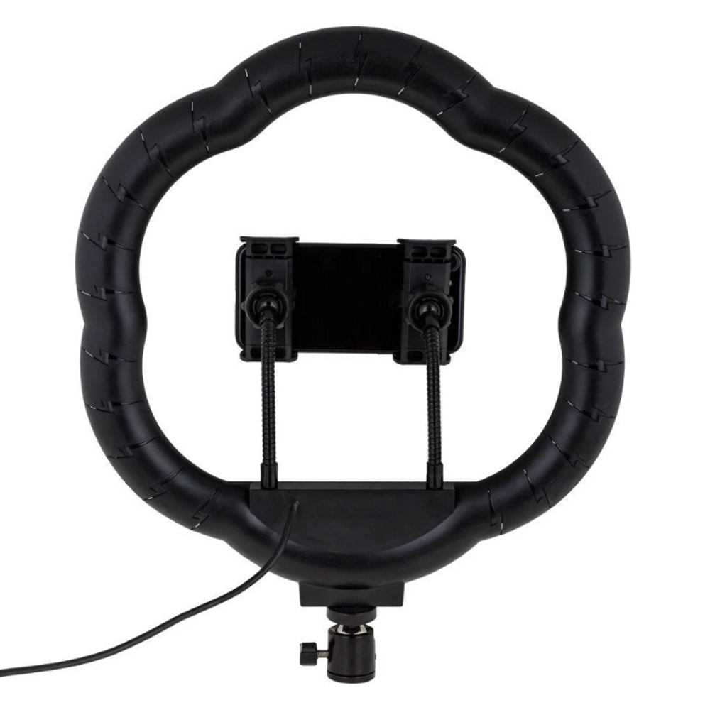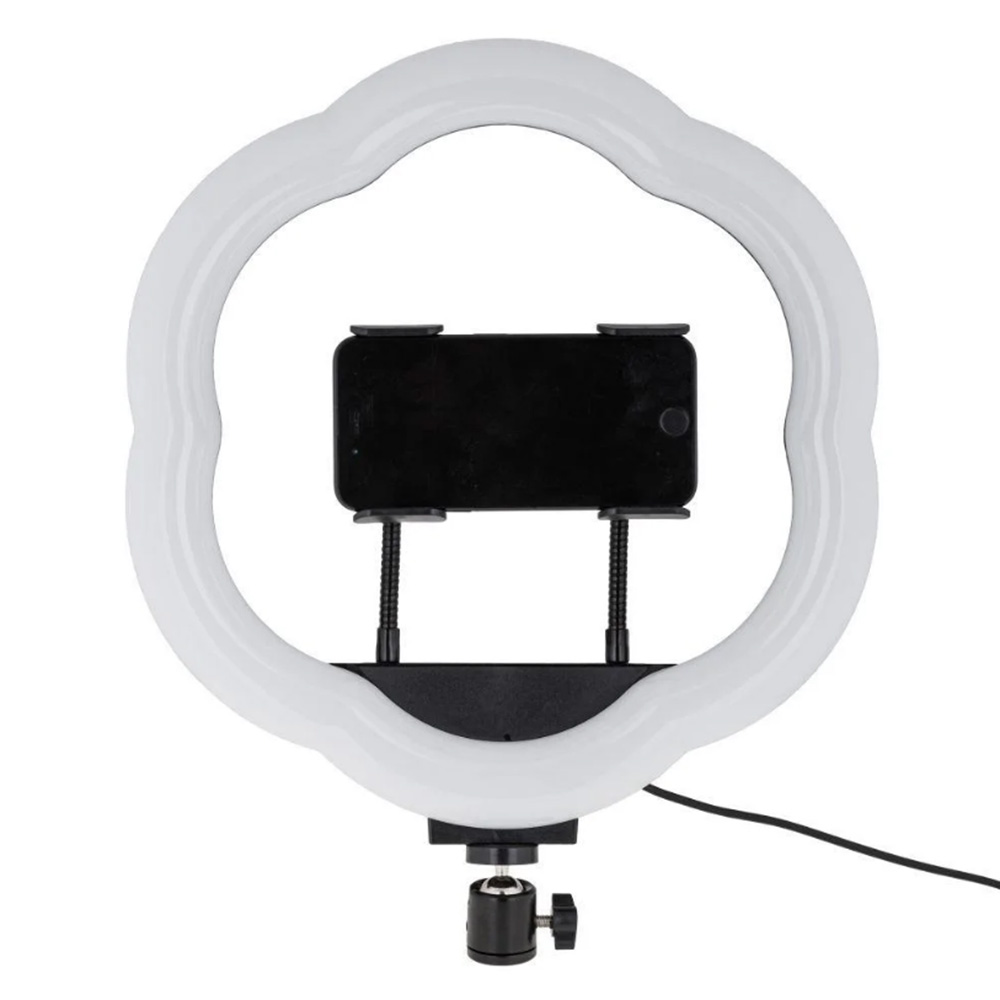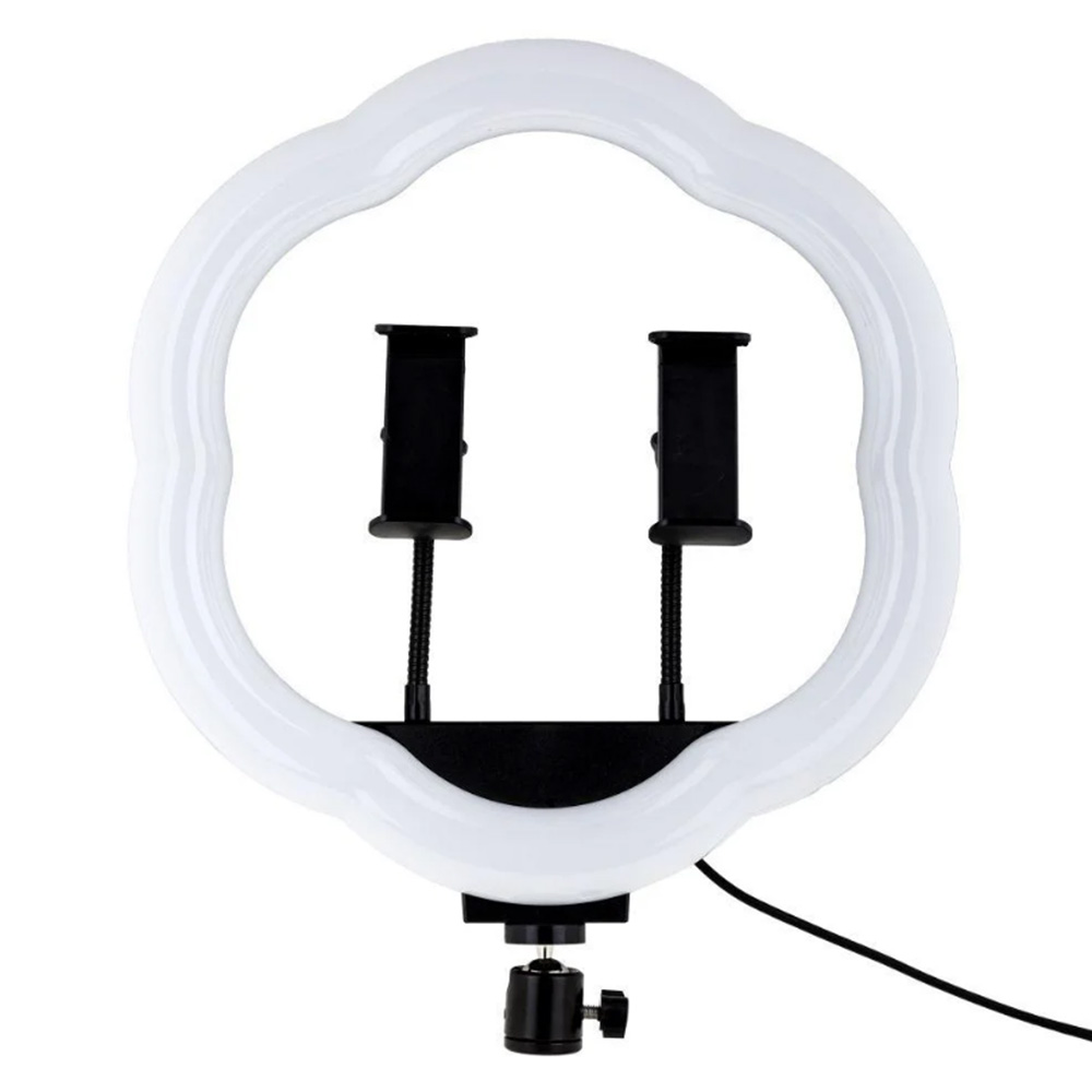 Можно сказать, что это кольцевая лампа, но с определенными отличиями. Первое отличие визуальная, лампа самом деле формы кольца нет, ее форма напоминает очертания цветка. Другое отличие состоит в том, что в комплект с лампой добавляется вплоть два держателя для телефона, а в самой лампе есть два отверстия для крепления этих держателей. Таким образом вы можете, или зафиксировать на лампе два телефона одновременно, или один с помощью двух держателей. Также в комплекте есть шарнирное крепление, которое позволяет фиксировать лампу во многих различных положениях.