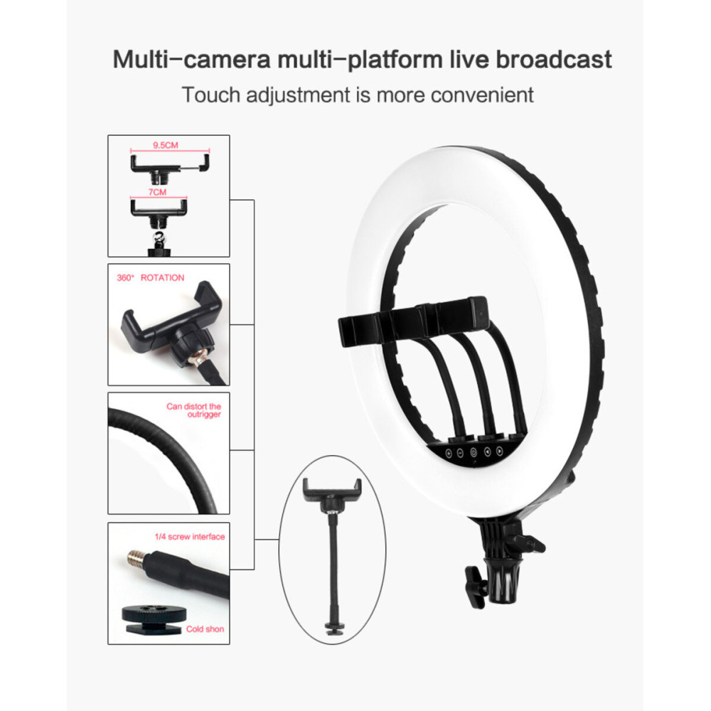 Кольцевая лампа диаметром 45 см — универсальное решение для качественного освещения во время видеосъёмок, фото, прямых эфиров, онлайн-встреч или создания макияжа. Благодаря 512 SMD-светодиодам она создаёт мягкий, равномерный свет без мерцания, который не утомляет глаза даже при длительном использовании. Устройство остаётся прохладным в работе, что повышает комфорт и безопасность.