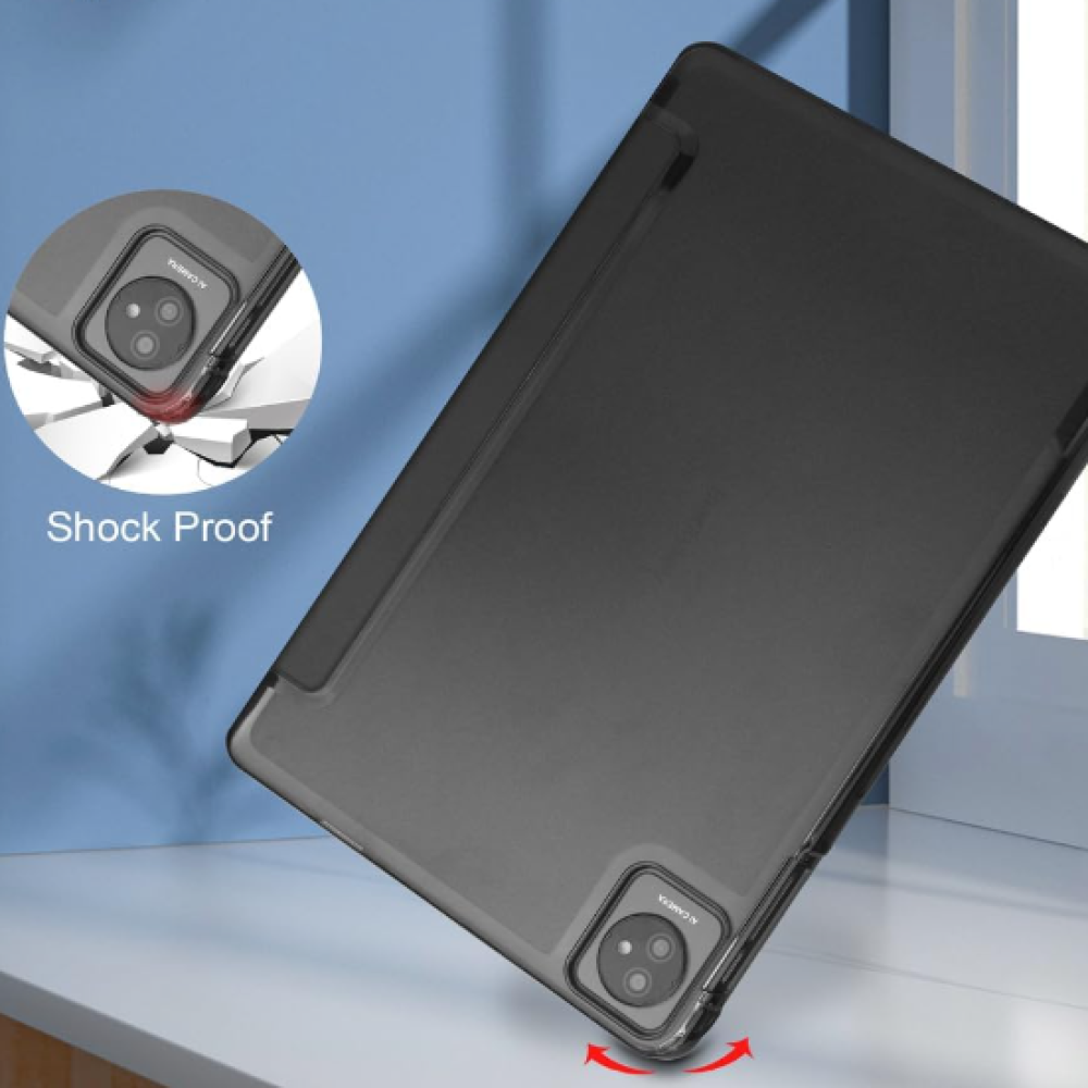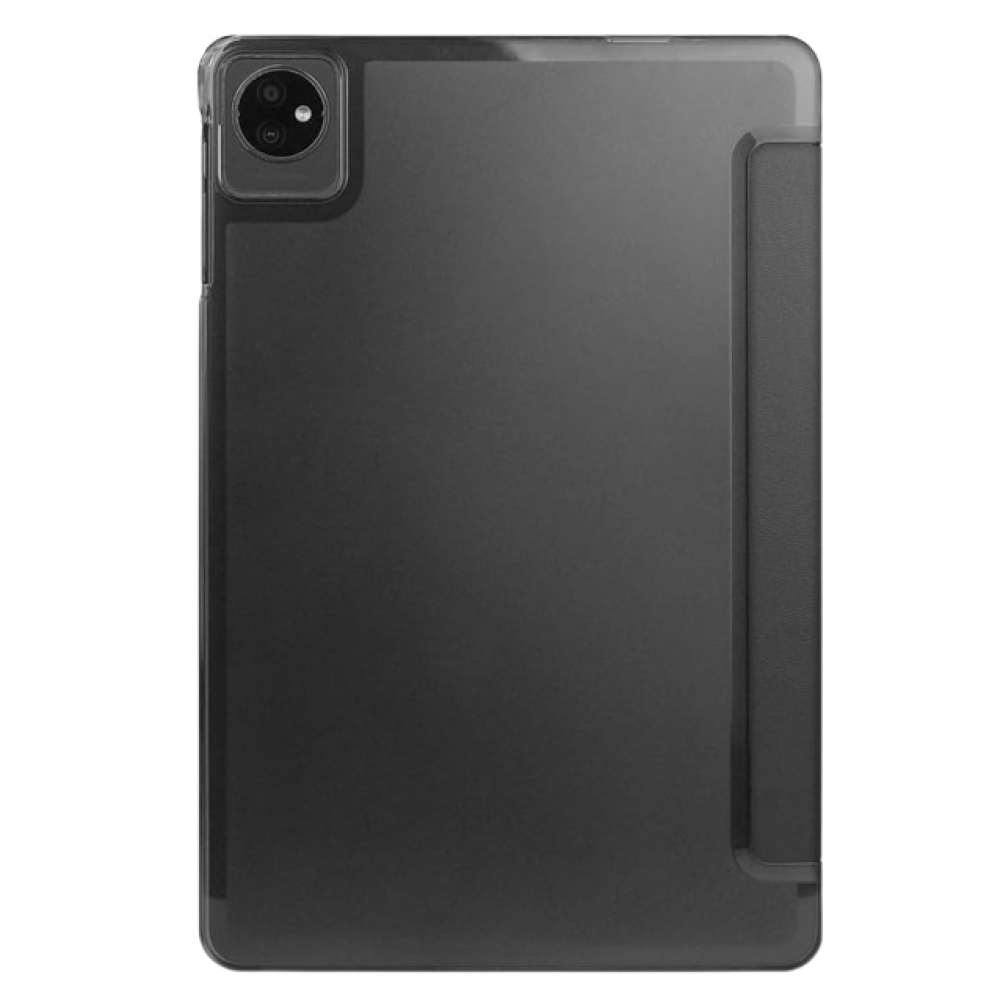 Чехол сделан из крепких материалов. Задняя крышка изготовлена из прозрачного материала, напоминающего стекло. Благодаря дизайнерскому решению крышку книги можно трансформировать в подставку для получения максимально удобного угла обзора экрана планшета.