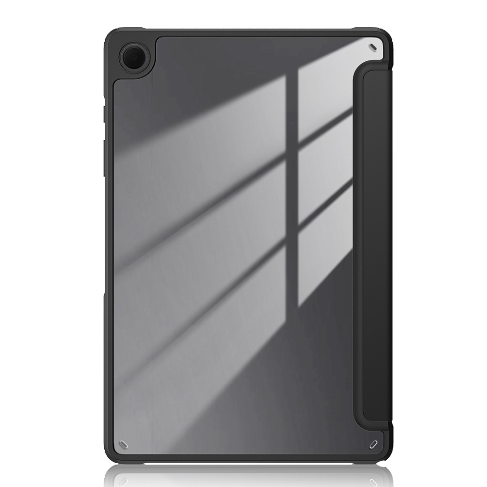 Чехол сделан из крепких материалов. Задняя крышка изготовлена из прозрачного материала, напоминающего стекло. Благодаря дизайнерскому решению крышку книги можно трансформировать в подставку для получения максимально удобного угла обзора экрана планшета.