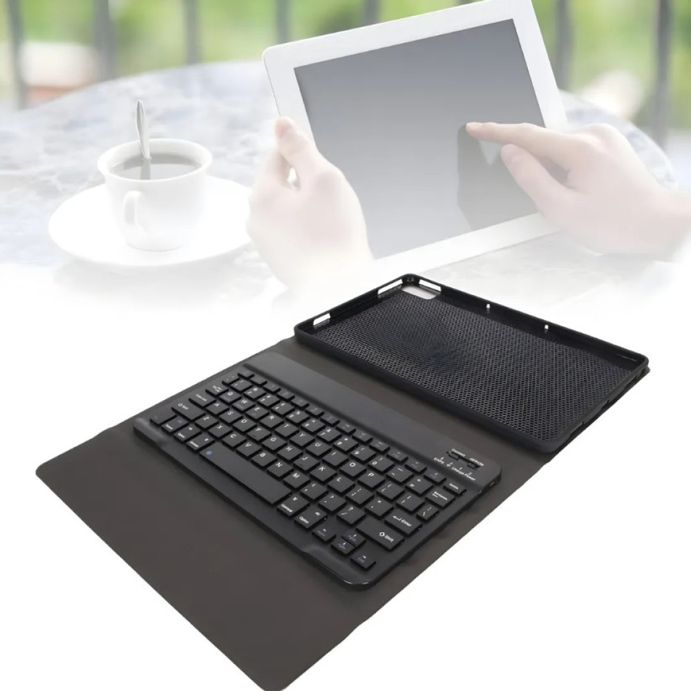 Клавиатура крепится к внутренней части чехла при помощи магнитов, благодаря чему её легко снимать и устанавливать. Подключение к планшету происходит через Bluetooth, обеспечивая быстрое соединение и стабильную работу.