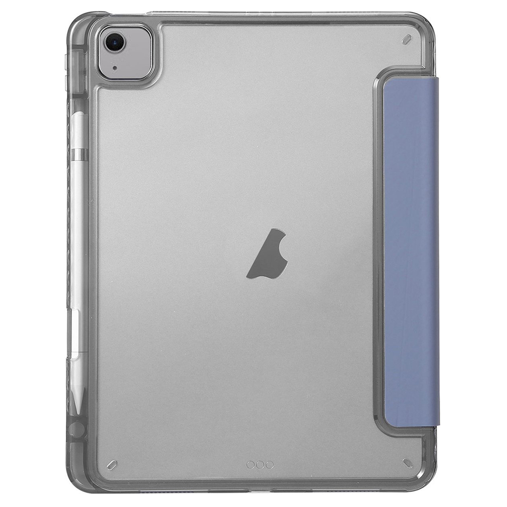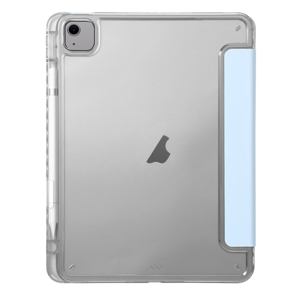Чехол сделан из крепких материалов. Задняя крышка изготовлена из прозрачного материала, напоминающего стекло. Благодаря дизайнерскому решению крышку книги можно трансформировать в подставку для получения максимально удобного угла обзора экрана планшета.
