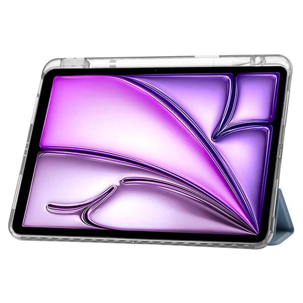Чехол сделан из крепких материалов. Задняя крышка изготовлена из прозрачного материала, напоминающего стекло. Благодаря дизайнерскому решению крышку книги можно трансформировать в подставку для получения максимально удобного угла обзора экрана планшета.