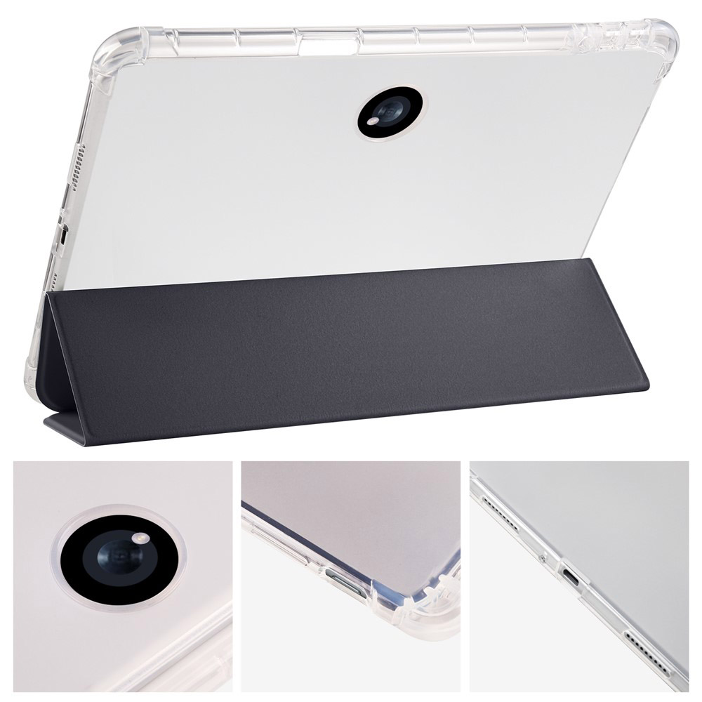 Чехол сделан из крепких материалов. Задняя крышка изготовлена из прозрачного материала, напоминающего стекло. Благодаря дизайнерскому решению крышку книги можно трансформировать в подставку для получения максимально удобного угла обзора экрана планшета.