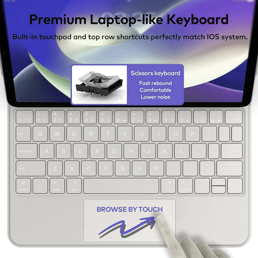 Вбудований високоточний мультитач-трекпад забезпечує швидку навігацію та повну підтримку жестів iPadOS, що значно підвищує продуктивність. Повнорозмірна клавіатура з рядом функціональних клавіш дозволяє легко керувати яскравістю екрана, гучністю та відтворенням мультимедіа.