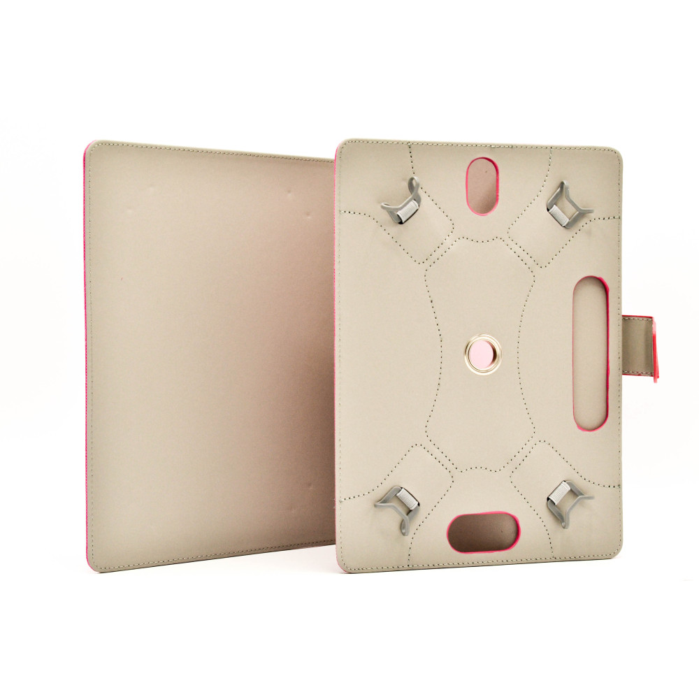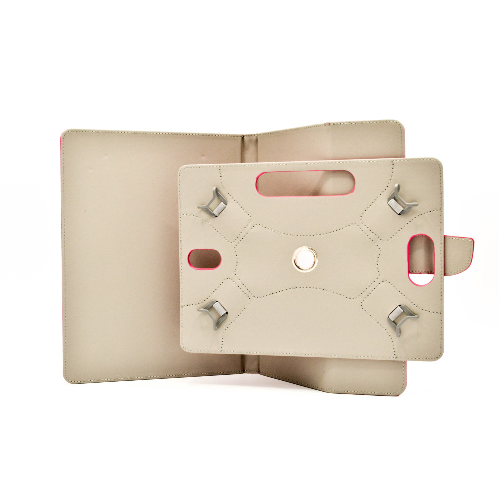 Материал изготовлен из прочной ткани снаружи и искусственной кожи внутри. Такая ткань обеспечит долговечное использование чехлом. Крепится планшет с помощью пластиковых держателей на гибких резинках с 4 сторон. На движущейся части аксессуара есть удобная ручка для установки в удобную позицию. Практически весь планшет будет закрытым и хорошо зафиксированным не только на держателях, но и благодаря крепкой магнитной застежке.
