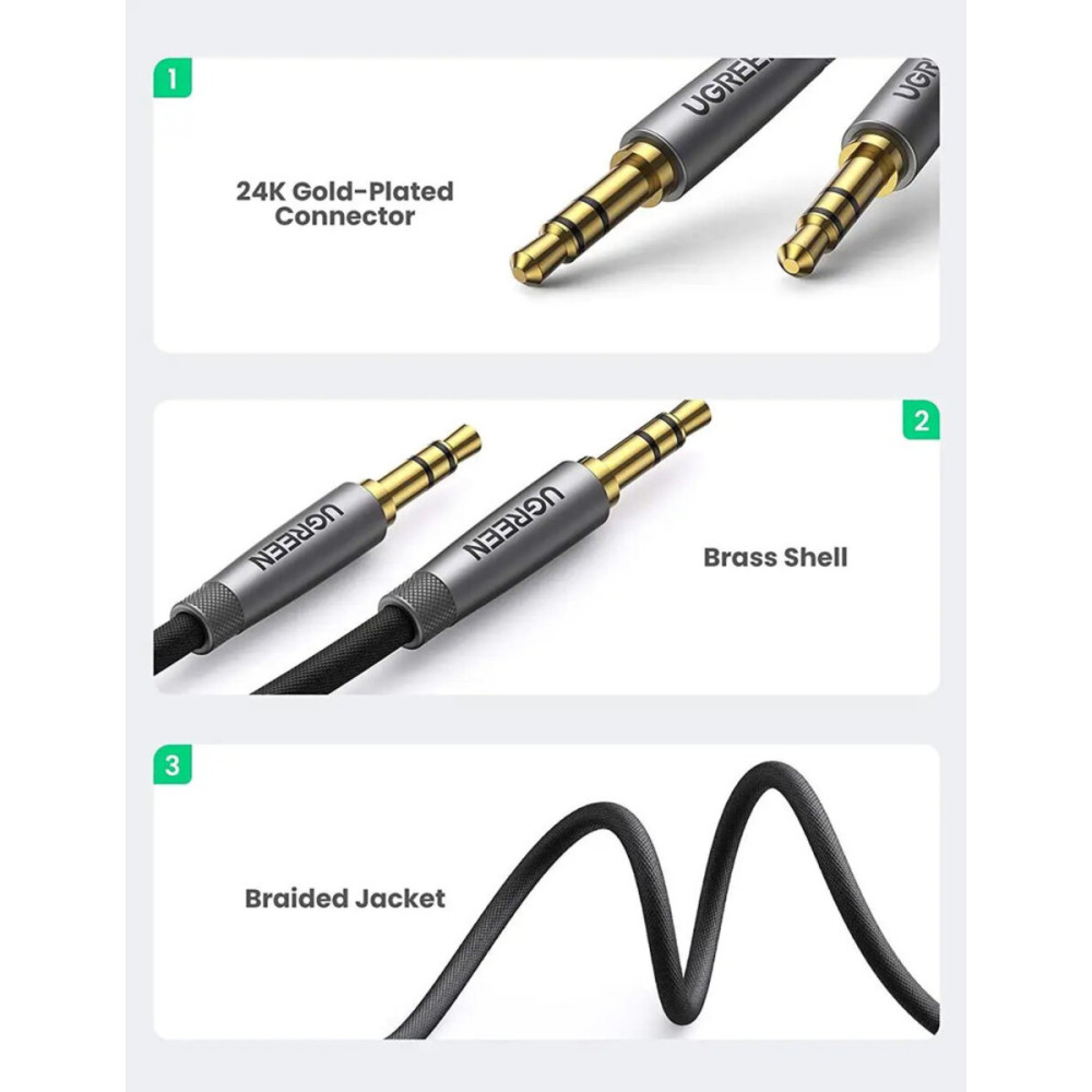 С позолоченным разъемом 24K штекерный аудиокабель UGREEN AV150 обеспечивает лучшую коррозионную стойкость и лучшую передачу сигнала. Металлический корпус премиум-класса предотвращает появление царапин и ржавчины.