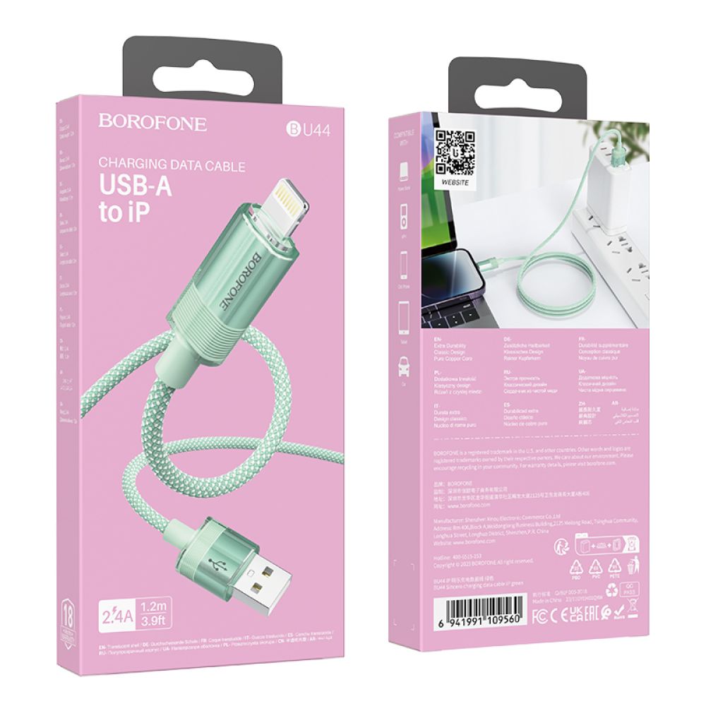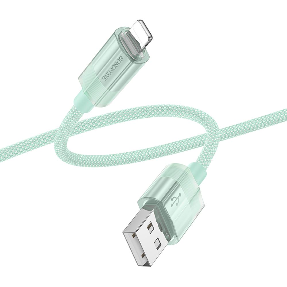 USB Borofone BU44 Sincero Lightning 2.4A 1.2m – это качественный кабель, который станет отличным выбором для повседневной зарядки iPhone, iPad и других совместимых гаджетов. Аксессуар привлекает внимание стильной расцветкой и прозрачными деталями корпусов разъемов, которые создают завораживающий визуальный эффект. Для его изготовления используются надежные электронные компоненты и износостойкие материалы, что гарантирует длительный срок службы и абсолютно безопасный процесс зарядки. Внешняя оплетка кабеля изготовлена из сверхпрочных нейлоновых нитей, переплетение которых образует оригинальный двухцветный узор. Она обеспечивает усиленную защиту медного сердечника от негативного внешнего воздействия, предотвращает спутывание, растяжение и образование разрывов. Корпуса его коннекторов изготовлены из прочного пластика, имеют приятную на ощупь поверхность и практичную форму со скругленными гранями. Четырехжильный сердечник кабеля диаметром 4.0мм состоит из 122 проводников (45/0.1*2 +16/0.08*2). Аксессуар поддерживает скоростную передачу данных и зарядку с максимальной силой тока 2.4A. Установление соединения между устройствами осуществляется через USB (male) – Lightning (male). Длина кабеля составляет 1.2м.
