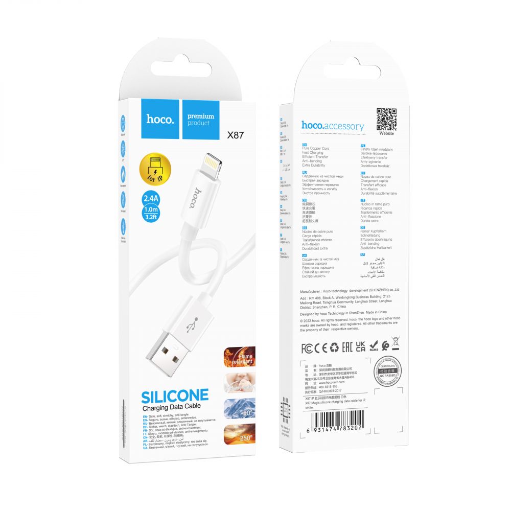 USB Hoco X87 Magic silicone Lightning - это надежный кабель, выполненный в полном соответствии со стандартами качества корпорации Apple. Аксессуар реализован в практичном дизайне, изготовлен с использованием высококачественных материалов, которые гарантируют его длительный срок службы, сохранность привлекательного внешнего вида и обеспечат пользователю приятные тактильные ощущения. Корпуса коннекторов имеют удобную форму со скругленными гранями и глянцевую поверхность, выполнены с усиленной защитой в местах соединений с кабелем. Внешняя оплетка кабеля реализована из прочного пищевого силикона, который отличается абсолютной безопасностью для человека и безвреден даже для детей, обладает стойкостью к растяжениям, разрывам, препятствует спутыванию, сохраняет свои свойства при температуре от -50 до 250°C и воздействии открытого огня. Аксессуар поддерживает передачу данных и способен проводить ток силой до 2.4A. Установление соединения между устройствами осуществляется через USB – Lightning. Длина кабеля - 1м.