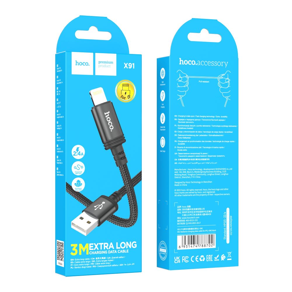 "Кабель USB Hoco X91 Lightning 2.4A 3m создан с использованием надежных электронных компонентов и материалов высочайшего качества для зарядки совместимых гаджетов и их подключения к компьютеру для синхронизации. Он выделяется привлекательным внешним видом и превосходными техническими характеристиками, что делает его отличным выбором для повседневной эксплуатации.