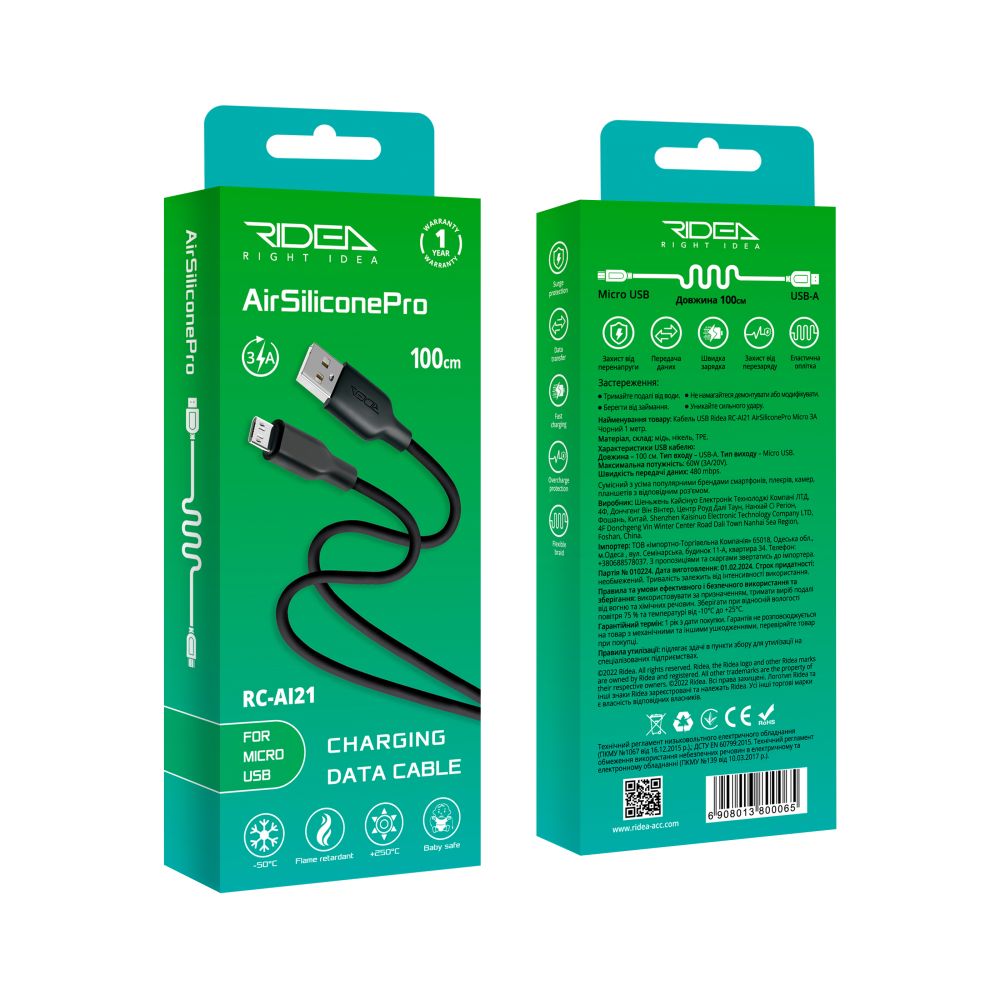 Кабель USB Ridea AI-21 AirSiliconePro Micro 3A – это доступное решение для тех, кто ценит высокое качество и надежность. Аксессуар реализован в достаточно сдержанном, но стильном дизайне, предлагается в двух классических расцветках. Он выделяется поддержкой быстрой зарядки с мощностью до 60W (20V/3A) и передачи данных с максимальной скоростью 480Mbps, что делает его отличным выбором для повседневной зарядки совместимых гаджетов и их подключения к компьютеру для синхронизации. Неразборные корпуса его никелированных коннекторов имеют практичную форму, изготовлены из прочного полимерного пластика. Высокоэластичная внешняя оплетка кабеля выгодно выделяет его среди аналогов, обеспечивает защиту от негативного внешнего воздействия и сделает повседневную эксплуатацию максимально комфортной. Она предотвратит его спутывание во время хранения и транспортировки, отличается экологичностью, повышенной стойкостью к разрывам, растяжению и открытому огню. Кроме того, она сохраняет свои свойства при экстремально низких и высоких температурах – от -50 до +250°C. Стабильность и безопасность процесса зарядки и передачи данных обеспечивается утолщенным многожильным сердечником из чистой бескислородной меди и качественным экранированием. Также, аксессуар оснащен интегрированной микросхемой для защиты гаджета от перенапряжения и перезаряда. Установление соединения между устройствами осуществляется через USB-A (male) – Micro-USB (male). Длина кабеля составляет 1 метр.