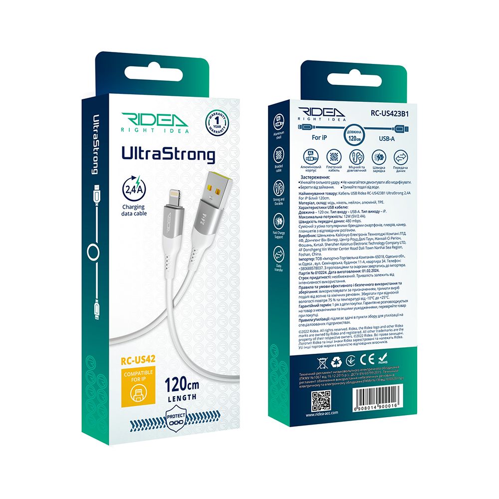 Кабель USB Ridea RC-US42 UltraStrong Lightning 12W 1.2m создан с использованием материалов высочайшего качества для максимально длительной, комфортной эксплуатации – повседневной зарядки совместимых гаджетов и их подключения к компьютеру для синхронизации. Аксессуар привлекает внимание стильным, изысканным дизайном, выделяется исключительной надежностью и отличными техническими характеристиками. Он поддерживает быструю зарядку с максимальной мощностью 12W (5V/2.4A) и скоростную передачу данных с пропускной способностью до 480Mbps. Стабильное соединение устройств обеспечивается никелированными коннекторами с износостойкими контактами. Их корпуса изготовлены из прочной комбинации алюминиевого сплава и термопластичного эластомера (TPE), имеют практичную форму с плавными изгибами и скругленными гранями. Удлиненная защита от изломов в местах их соединения с кабелем декорирована оригинальным узором с перфорацией для обеспечения дополнительной гибкости. Внешняя оплетка кабеля выполнена по особой технологии плетения из усовершенствованного нейлона. Ее повышенная стойкость износу, растяжению и разрывам гарантирует защиту медного сердечника от негативного внешнего воздействия в любых условиях. Установление соединения между устройствами осуществляется через USB-A (male) – Lightning (male). Длина кабеля составляет 1.2м.