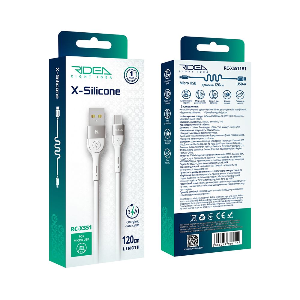 USB Data-кабель Ridea RC-XS51 X-Silicone 3A MicroUSB 1.2m, White